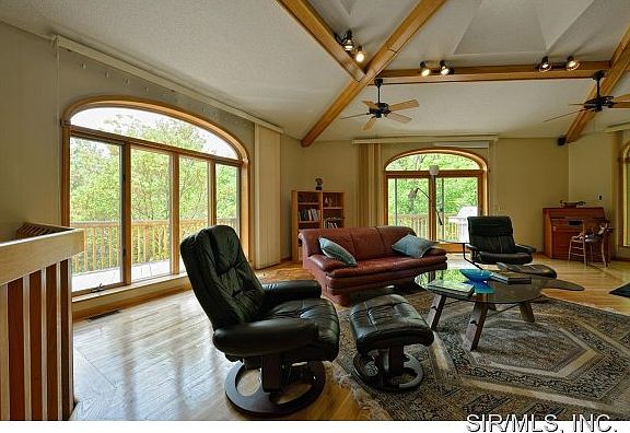 Straight out of Magnolia Home! Gorgeous, tasteful, and comfortable. Stunning views of the wooded backdrop from almost every angle of the home. Custom built ranch in the Steeplechase neighborhood! Hardwood floors, split bedroom floorplan with the guest bedrooms sharing a full bath and a spacious laundry room. The living room has a two story vaulted ceiling with wood beams, fireplace, inset shelving and skylights. The open eat in kitchen is off of the formal dining area and offers a coffee bar, granite counters, gas stove top range, built in oven and microwave, refrigerator and island. The master suite has a large walk in closet and a stunning master bath with custom tiled shower and double bowl vanity and tiled floors. The finished basement has new laminate wood flooring and tile, a 4th bedroom, a workshop and access to the 3 car garage. Over an acre of privacy and a floorplan you won't find anywhere else! O'Fallon schools minutes to Scott Air Force Base!