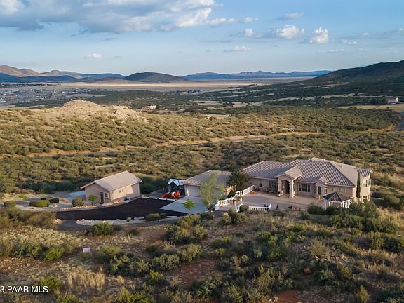 Here is an Incredible ''One Owner'' CUSTOM Ranch with a Tuscan flare on nearly 12 Acres in Prestigious PRESCOTT RIDGE built by Crystal Creek Builders with Fabulous VIEWS of Granite Mountain, Thumb Butte, Mingus & Bradshaw Mountains. This fine home features 3800 sq ft of Quality Living Area for the Main house and Basement plus a 720 Sq Ft detached Guest Casita. Main house has 3 Bedrooms + Media Room, Den, or possible 4th Bedroom, 3 Baths, 3Car Garage.....has Formal Dining Room w/indirect lighting, Formal Living Room w/Pass Thru Gas Fireplace, 20'' Porcelain Tile throughout, Ceiling Fans, Surround sound, Central Vac, + Bonus (enclosed Arizona Room)!!! Gourmet Kitchen has Knotty Hickory Cabinetry, GRANITE Countertops, GRANITE Back Splash, huge Island w/Veggie Sink, Built In Fridge,