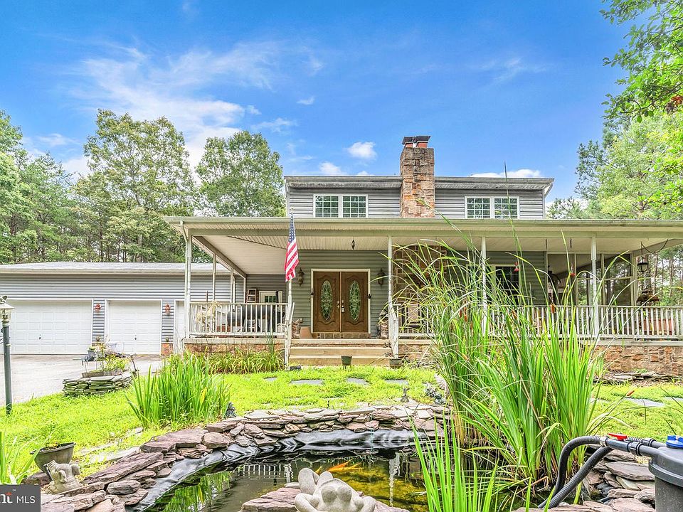 This spacious Colonial-style home sits on 4 wooded and private acres and offers over 4,000 square feet of living space. The oversized attached 4-car garage—complete with heavy-up electric, workbench, and multiple bay doors—makes this property a dream come true for hobbyists, car enthusiasts, or anyone needing serious workshop space. While the home could benefit from some updating, it is priced to reflect the condition and offers incredible potential. As you approach, you’ll be greeted by a wide covered front porch overlooking a peaceful karaoke pond—ideal for morning coffee or unwinding in the evening. Step through the double front doors into an expansive great room featuring vaulted ceilings, a floor-to-ceiling stone fireplace with pellet stove insert, recessed lighting, dual ceiling fans, custom log mantle, and abundant windows that fill the space with natural light. Hardwood floors flow throughout the main level. The main level also offers a private office with LPV flooring, recessed lights, and ceiling fan, a main-level bedroom with double closet, and a full bathroom with marble vanity and tub/shower combo. A large screened-in porch—connected to the front wraparound porch—sits off the great room and is wired for a hot tub. It’s ready for your finishing touches with new ceiling fans and screens. The kitchen area leads to a mudroom-style laundry room with extra cabinetry, laundry sink, fluorescent lighting, and newer front-load washer and dryer. The upper-level owner’s suite is generously sized and features a sitting area, massive Texas-sized walk-in closet, and a full ensuite bath. New sliding doors off the suite provide access to private balcony. Downstairs, the fully finished basement includes a spacious recreation room, additional bedroom, and full bath. The basement also offers a separate entrance via new doors and has a sump pump, a second pellet stove (not yet installed, tile and ductwork convey), and extra materials including drywall and brick pavers that are included in the sale. The oversized four-car garage includes a large two-car bay door, two single doors—one with extra clearance for trucks—and is fully equipped with shelving, a workbench, and two brand-new garage door openers ready for installation. Additional highlights include dual-zone heat pump systems, a water conditioning system, and a new well pump installed in 2024. There is also a designated forest conservation area within the 4-acre lot. The 30x18 wooden deck with pergola offers the perfect space for outdoor entertaining, with steps leading to a brick patio and former pool area—now ready for repurposing. This is a rare opportunity to own a private, spacious Colonial with serious garage space and endless potential—sold as-is and ready for your custom touches.