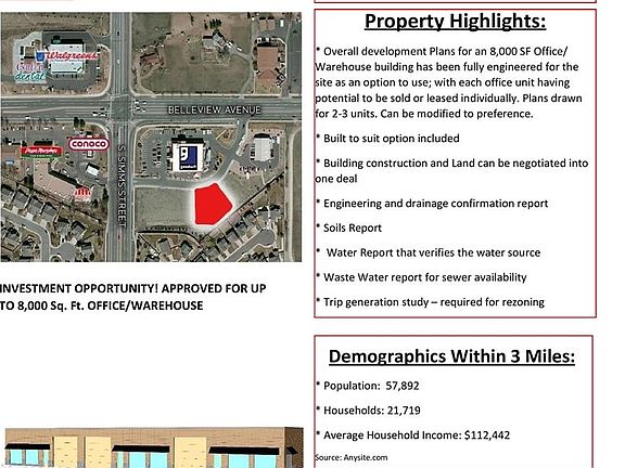 Investment Opportunity!!! BUILT TO SUIT OPTION - ZONED FOR COMMERCIAL & RESIDENTIAL - Land and building bundle available - Land sale can include: * Overall development Plans for an 8,000 SF Office/ Warehouse building has been fully engineered for the site as an option to use; with each office unit having potential to be sold or leased individually. Plans drawn for 2 units. Can be modified to preference. * Built to suit option included * Building construction and Land can be negotiated into one deal * Engineering and drainage confirmation report * Soils Report * Water Report that verifies the water source * Waste Water report for sewer availability * Trip generation study - required for rezoning