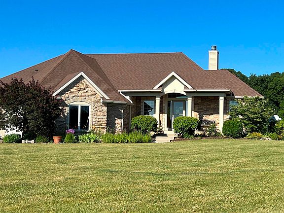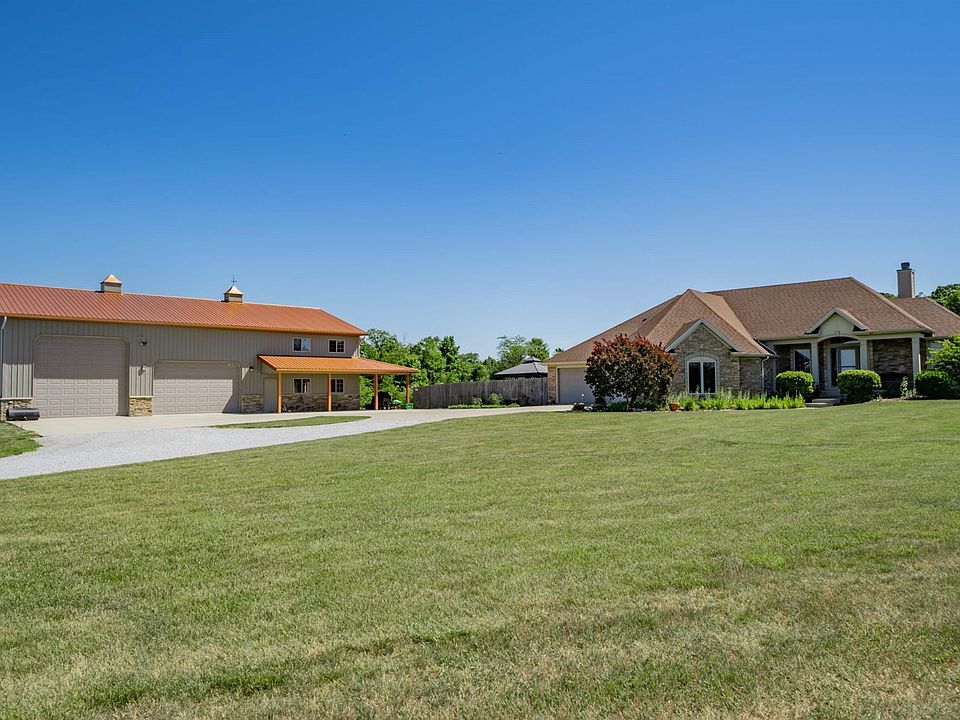 23 fantastic, partially wooded acres that surround an impressive over 4000 sq ft Bob Buescher custom build home featuring 4 bedrooms--2 on main level and 2 on lower level with 3 full and 1 ½ baths. A winding drive brings you past a quarter acre aerated pond to the home and a custom barn. Imagine a 2688 sq. ft. barn with steel and drywall finished interior over foam and batt insulation offering an upper level 840 sq. ft. office/apartment with heat and air, as well as a 840 sq. ft. shop with heat and air on the main level. Inclusive of a 16' RV door and 12' 2 bay door, pull-down LifeStyle screens installed on 2 bay side of barn and also on house garage. This well-designed home features Harlan custom cabinets, walk in pantry, HD TV antennae in attic, surround sound wired upper and lower levels, rear deck access from dining area and master bedroom, concrete patio, large fenced yards and natural drain basement--no sump pump needed. Beautiful, private wide trails throughout the woods for walking or riding. Pond is stocked with fish appropriate for swimming and aerated year-round, beach area and sand ramp to enter. Total utilities $475.00 to $500.00 avg monthly with Water Furnace geothermal open loop system. Main house wired with separate generator panel covering key home areas, generator provided with 7000 running watts and new battery for electric start. Tons of storage in the house and barn. Front and back fields are farmed by local farmer--this year soybeans giving a well-maintained property view as you drive in.