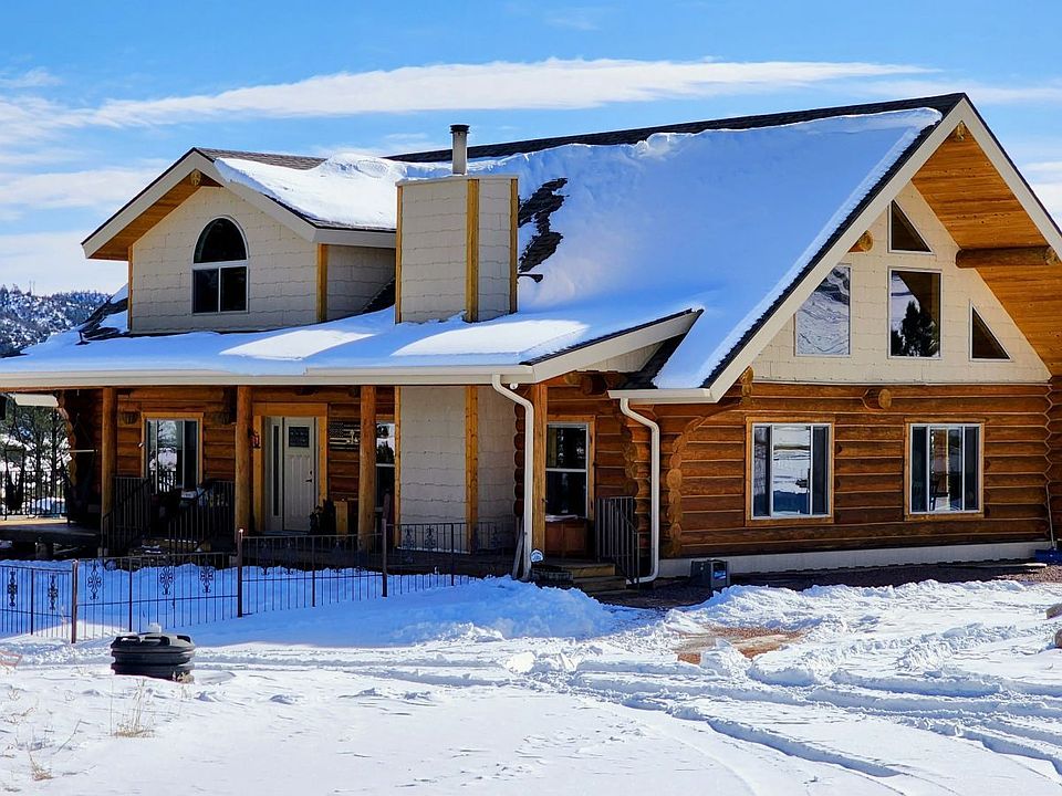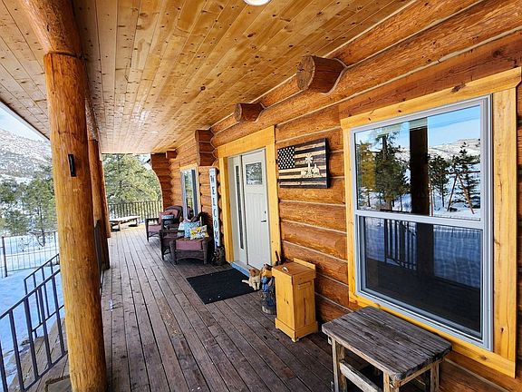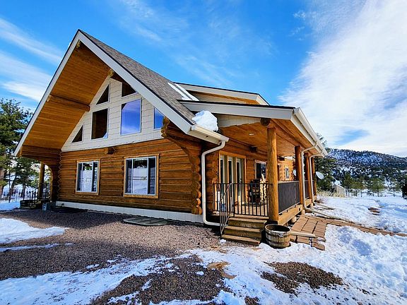 Welcome to this exquisite, custom log home tucked away on 36.9 acres with a creek that flows through the property. It fulfills all your dreams of mountain living. The 3 bed 3 bath home shows off the natural beauty and magnificence of its design. Extravagant log beams span throughout the naturally lit open floor plan. Picture yourself in the beautiful kitchen, with stainless-steel appliances, stylish white cabinets, hammered-copper farmhouse sink, granite countertops, and a massive island. Cozy yourself by the fire, which can heat the entire home with the venting system. Or click on the furnace and keep warm that way. Admire the stunning mountain view from any of the windows throughout the home. Within the spacious main-level bedroom, is a gorgeous bathroom featuring a double vanity with granite, hammered-copper sinks, a large tiled shower, and an inviting soaker tub. Live-edge wood staircase takes you to an airy loft, with two bedrooms, bathroom, and an exterior balcony. Massive unfinished basement can be finished to your desire. $836,000. For more information and a tour, call James Thomas Independent Real Estate Broker at Martin and Tope Real Estate Company 719-431-1754