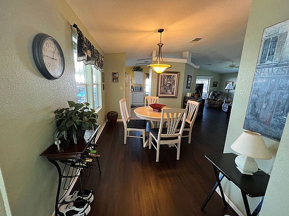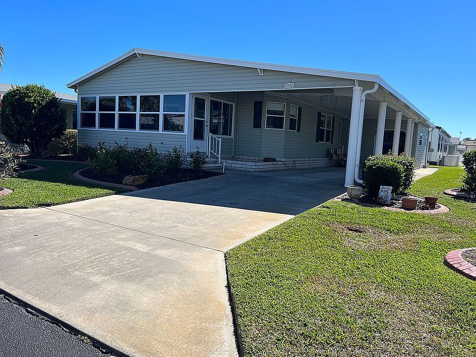 Lovely 2 bedroom 2 bath home. Turn key, ready to move in with flexible closing date. Large open eat in kitchen with plenty of cabinets. Separate dining area. Enclosed front Lanai with beautiful furniture just off the amazing living room. Large master bedroom with walk-in closet. Spacious en-suite bathroom with double sinks, step in shower (with seats) separate area with makeup mirror, lighting and a seat. Wide hallways and doorways, fabulous laminate flooring, carpet in the bedrooms with tile in bathrooms and kitchen. Large drive and carport. Great golf cart garage with storage plus an extra shed for storage behind the golf cart garage. No golf cart. New shingled roof and aluminum carport roof in 2022 Lot rent $826.91 Text 905-925-1156 to book a viewing or to discuss details. House is being sold “as is”. Come and make us an offer.