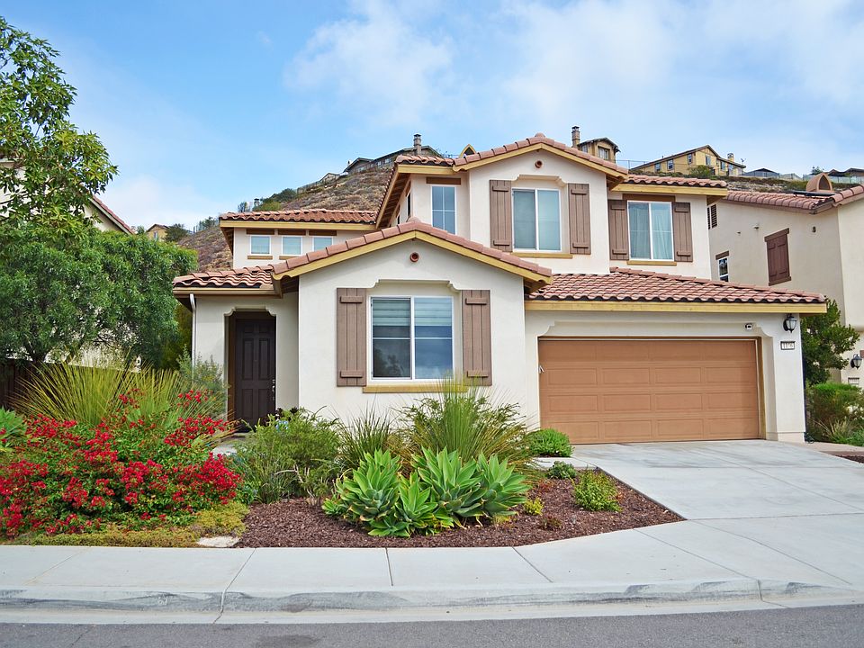 Nestled on one of the most desirable cul-de-sacs in San Elijo Hills and displaying pride of ownership inside and out, this Terraza charmer is the one you've been waiting for! You are immediately welcomed into this stunning, newer built home with an open and airy floor plan featuring lovely wood floors, entry level bed and bath, family/optional play room, dining room, open concept bright white kitchen with granite counters, stainless steel appliances, double ovens, ample cabinetry, built-in study nook, and center island overlooking living room. Head upstairs to 3 spacious secondary bedrooms and expansive master suite boasting a spa-like bathroom and walk-in closet. Step outside and relax in the lush and tranquil backyard that backs to slope offering privacy, a built-in fire pit, and additional space for playing and entertaining with ease. Enjoy all the perks of living in S.E.H without the high Mello-Roos, plus low utility bills with leased solar panel electric system. Zoned for new K-8 Double Peak School!
