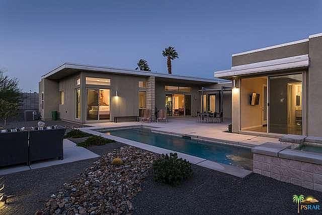 FOUR bedroom, FOUR bathroom MODERN property with SOUTH-FACING pool and spa offers brilliant architecture, green construction, and energy efficient systems including SOLAR panels, high-efficiency HVAC units, tank less water heater and more! High ceilings, floor to ceiling glass, modern cabinetry with quartz counters and polished concrete flooring throughout. Modern kitchen with Bosch appliances and large island opens to the spacious great room that delivers panoramic mountain views and access to the pool and spa. Master Suite has views, access to the south-facing pool/spa, walk-in closet and spa-like bath with dual sinks, large walk-in shower, and separate soaking tub. Junior Ensuite Two and Three, which are on the other end of the house, each have their own private bath. Detached guest house (Junior Ensuite Four) has a private entrance, bar area, private bath, and mountain views. Interior laundry with sink, attached two car garage, and an extra-long RV-sized driveway!
