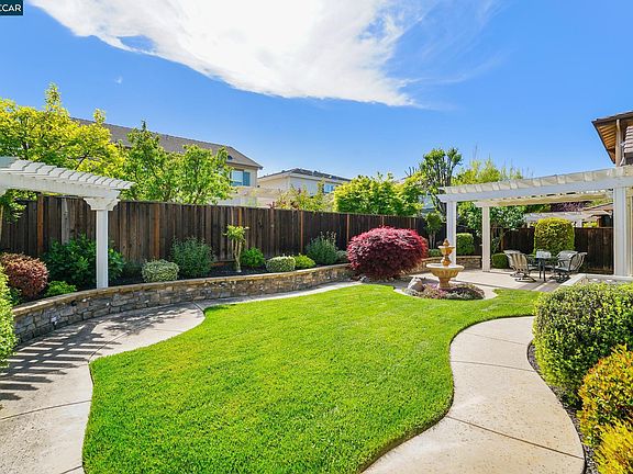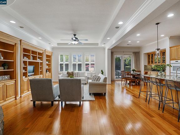 Perfection in Desirable Pleasanton Neighborhood Located on a tree-lined cul-de-sac, this elegant and meticulous single-story family home is move-in ready! The open floor plan, volume ceilings, plantation shutters and gorgeous hardwood flooring throughout are some of the special features. Formal dining room is 4th bedroom/office option. The spacious eat-in kitchen has a large island and is open to the great room with access to the backyard patio. The beautifully landscaped backyard includes pretty arbors, natural stone hardscape, colorful bushes, and flowering trees. The lush lawn and bubbling fountain create a tranquil ambience. Enjoy the community swimming pool, playground and greenbelt. Conveniently located near shops, restaurants, the Iron Horse Trail, and award-winning Pleasanton schools.