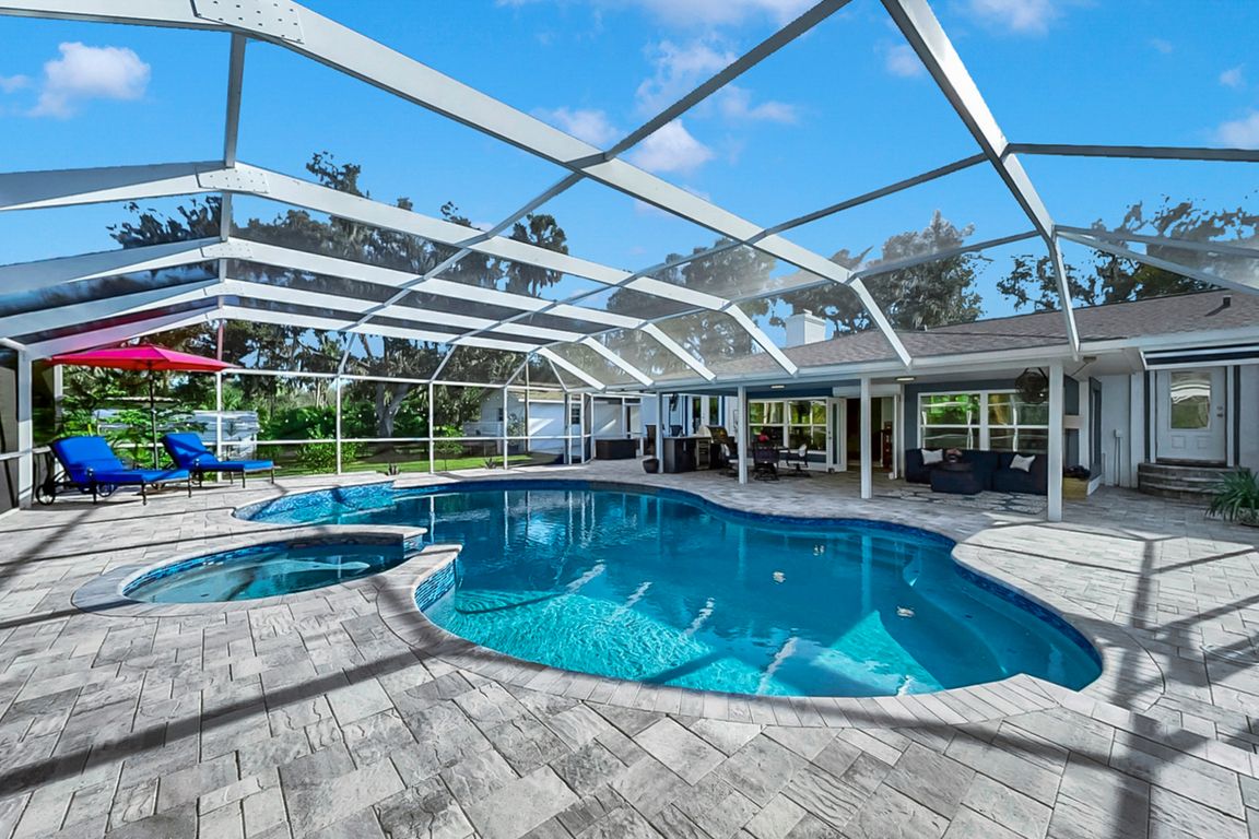 - Pool features: Child Safety Fence, Gunite, Heated, In Ground, Outside Bath Access, Salt Water, Screen Enclosure, Tile