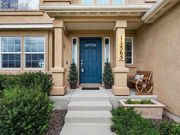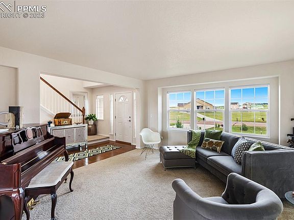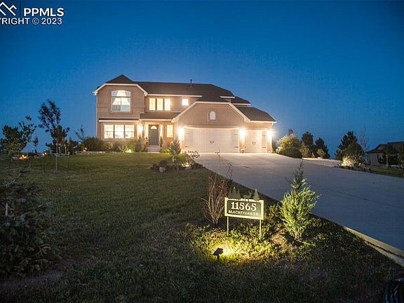 Pictures don’t do this beauty justice, so come “oooh & aaah” in person before it’s gone! This 4-bedroom house is GORGEOUS and so are its 2.5 acres & neighborhood. Perched among the rolling hills of Antler’s Ridge, this cared-for, spacious 2-story perfectly blends city and country. The endless ceiling in the great room, fireplace, giant windows & views take your breath away! The large kitchen has rock backsplash, modern open shelving, pantry, granite countertops, stainless steel appliances, solid maple cabinetry & sleek pulls. The open staircase, Juliet balcony, arched windows, and sprawling master to the jetted tub scream luxury. Enjoy reliable, ultra-fast Fiber-To-The-Home internet! The large finished basement, billiards room, huge walk-in closets, 3-car garage & big back deck are enviable. You will literally gasp at the 50+ mile unimpeded view. So much space inside and out! Bask in the tailored landscaping of green/soft sod, stone benches, white rock pathways, a multitude of mature evergreens & decorative trees/shrubs — a park right at home! This property has high-efficiency LED lighting, hardwired security system & speaker hookups, plus patio & rock speakers in the yard to entertain. Want fun? There are 4x4 areas bordering the neighborhood, & miles of Meridian Ranch & Falcon Trails at a 5-min walk. Antler Creek golf course is a 4-min drive. Section 16 & Homestead Ranch Regional Parks about a 10-min drive. Horses? Latigo Trails Equestrian facility is a stone’s throw. 12 minutes to Powers, easy Base access from 24. 6 mins to Safeway, Walmart and vast dining.