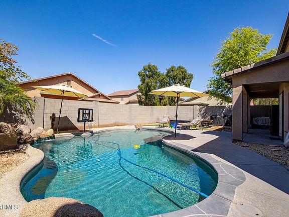 Welcome to your dream home! This stunning 5-bed, 3 bath home with 3348 square feet, offers abundant space. The home is thoughtfully designed with ample storage space, ensuring organization and functionality for everyday living. For car enthusiasts and hobbyists alike, the 3-car garage is a true gem, featuring an additional 2 feet for accommodating trucks and toys. It's a mechanic's dream come true! Step outside into your own private oasis. The resort-style backyard beckons with a sparkling pool adorned with a serene waterfall, perfect for relaxation and entertaining guests on warm summer days. The heart of the home lies in the kitchen, equipped with state-of-the-art smart appliances that enhance both convenience and efficiency. Practical upgrades abound, with the HVAC system replaced in 2023 and a new water softener ensuring optimal comfort and efficiency. The downstairs bathroom has been tastefully remodeled, adding a touch of modern elegance to the home. Environmental consciousness meets cost savings with solar panels leased through Tesla, offering sustainable energy solutions for environmentally conscious homeowners. In addition, custom sunscreens adorn every window, providing enhanced privacy and energy efficiency year-round.Convenience is key with an extra-long driveway, providing plenty of parking space for family and guests. Don't miss the opportunity to call this beautiful property home.
