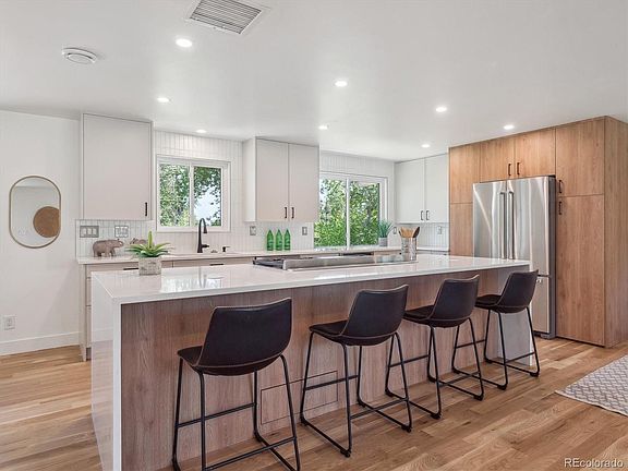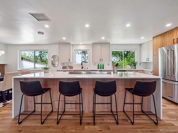 Welcome to this stunning remodeled home in highly sought-after Applewood. Thoughtfully designed with premium finishes and modern amenities, this residence offers a versatile floor plan. The main level features an open-concept layout with natural light, seamlessly connecting the living and dining spaces. At the heart of this space is a gourmet kitchen, complete with quartz countertops, double ovens, a wine fridge, and an oversized island, making it perfect for both entertaining and everyday living. On the lower level, you’ll find a spacious family room with a cozy fireplace, a private bedroom, a full bathroom, and a sunroom. The upper level features a luxurious primary suite with a spa-like bathroom, along with two additional bedrooms and a beautifully updated bathroom, offering comfort and privacy. The basement provides additional flexibility, featuring a second family room – perfect for media or game nights – as well as a private bedroom, full bathroom, and a convenient laundry area. Outdoor living is a highlight, with a heated sunroom for year-round enjoyment and an expansive patio for outdoor dining and entertaining, all set against the tranquil backdrop of the Rocky Mountain Ditch, providing a peaceful natural setting. Modern upgrades throughout the home include a new roof, furnace, A/C, tankless hot water heater, and recent sewer repair, ensuring comfort and peace of mind. With a 2-car garage with 220 charging, automatic sprinkler system, and central air, this home is truly move-in ready. Located with easy access to I-70, 6th Avenue, and major commuter routes, this property is just minutes from Golden, Denver, Crown Hill Open Space, Applewood Village, and Lifetime Fitness, making it a prime choice for those seeking both convenience and luxury. This home blends elegance with practicality, offering endless possibilities for modern living.