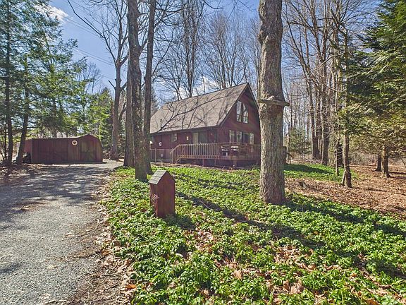 Cozy, well maintained, chalet available in Locust Paradise. New Roof 2021. Home features an open floor plan for Living/Dining/Kitchen. Large windows and slidder allows plenty of natural light. Wood burning fireplace provides a cozy spot on the cold winter nights. 2 bedrooms on the first floor, oversized bedroom and 1/2 bath on second floor. Enjoy spending time outside on the oversized front deck. Home sits on .92 acres to provide plenty of outdoor space. Gated side yard for your fur babies.