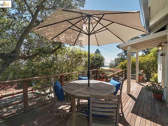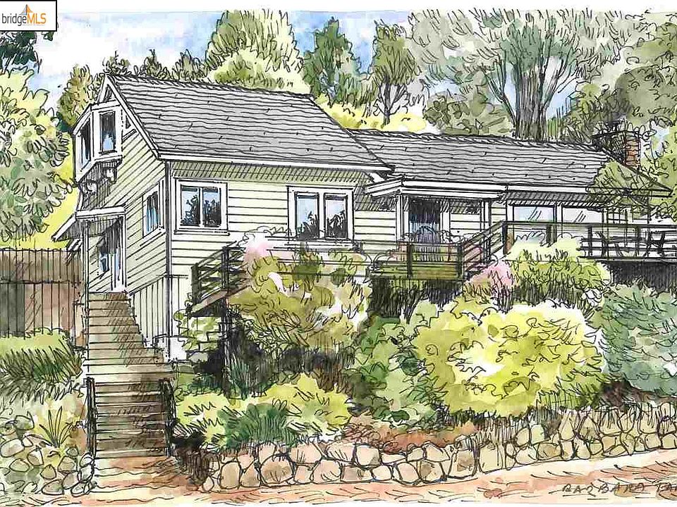 Up the steps over the Japanese footbridge, next to the flowering Magnolia, sits this pretty 1951, 3 BD, 1.5 BA Berkeley Hills cottage. Enter into the open living room and see the handsome vaulted wood ceiling. Sliding glass doors open onto a front deck that looks out past trees, city and the Bay. Random plank Oak floors through the living/dining/kitchen. Upstairs the warm exposed wood A frame surrounds the Bay Windows with built-in view-seat and half-bath. The ground level has two bedrooms with bamboo flooring and a bathroom with stone & original tile. Open the back glass doors onto the large sun-drenched garden, and see the wooden hot tub & outdoor shower and gentle upslope and terraced yard. A detached office / creative space with electricity, bamboo floors, windows and sliding glass doors. New roof & other upgrades. House also comes w/2 sets of architectural plans. Equidistant to UCB, shops & Tilden. Hang your hat in this lovely gem.