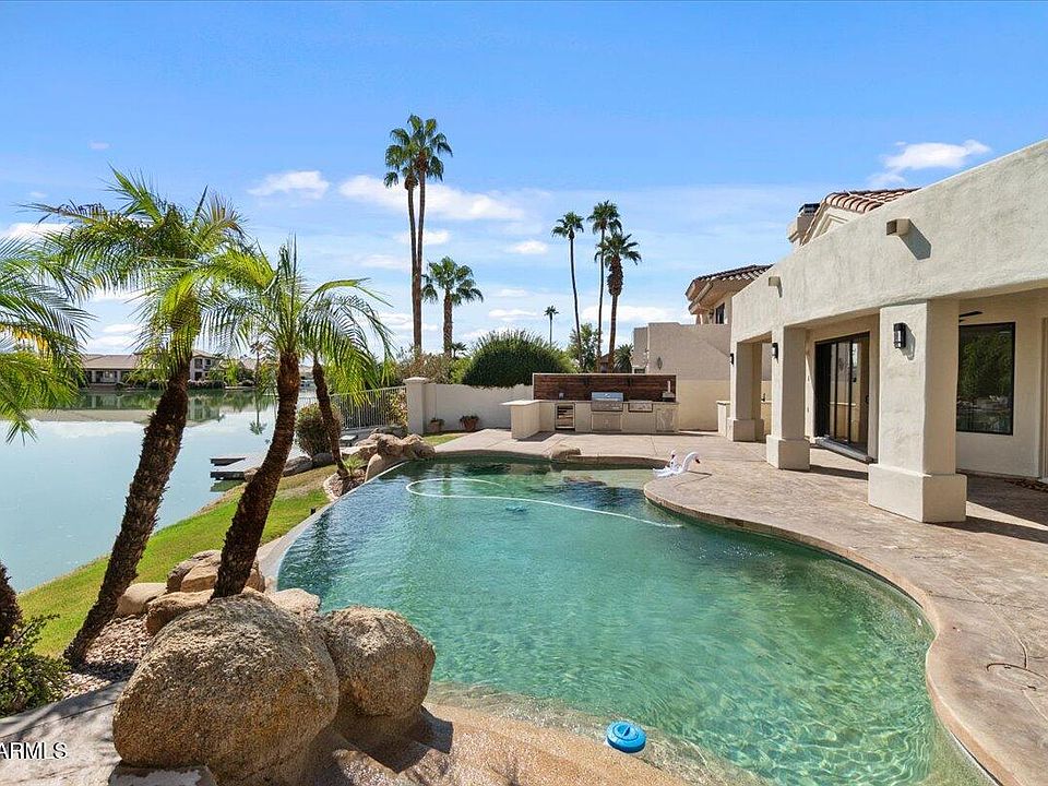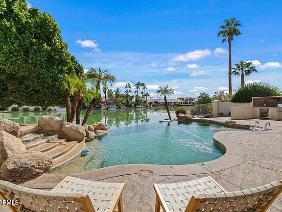 Exquisite 4-bedroom, 4-bath waterfront residence in Gilbert offering over 4,000 sq ft of refined living. Positioned on a premier cds lot w/lots of extra parking, this home combines modern luxury with timeless design. The gourmet kitchen showcases high-end finishes and opens to expansive living areas w/luxury vinyl flooring & carpet throughout. The lower level includes versatile basement retreat, ideal for entertainment or relaxation. Outdoors enjoy a resort-style setting with an infinity-edge pool, private dock, and spacious patio—perfect for hosting or unwinding by the lake. Many extra rooms! Owned solar enhances efficiency and sustainability. Located within minutes of shopping, dining, top-rated Gilbert school district and parks, this waterfront beauty delivers an exceptional lifestyle!
