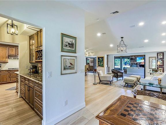 FOUR SEASONS = NO HOA’S, 1 ACRE HOME, HIGH & DRY, not in any FEMA flood zone! This serene location is one of the area’s best kept secrets. A North Naples estate property supporting a gorgeous recently renovated home toward the cul-de-sac end of a quiet street. The glass front doors & lit gallery walls lead to a sophisticated lounge style living room that flows through the telescoping sliding glass doors into an incredible 1,000 sq. ft. Florida room including a large masonry wood burning fireplace! And there’s so much more, a 40' long new saltwater lap pool with a sun deck, bubbler fountain, and exotic tropical landscaping for just the right atmosphere. The open floor plan has a kitchen that is a chef’s dream with a gas stove, custom cabinetry, butler’s pantry & expansive counter space. The Living, Master and Dining-room doors open completely for a total free flowing experience! The split floor plan offers your family & guests 4 more bedrooms, 2 of which are spectacular suites, a rare find! Enjoy walking or bicycling on the wide streets in this tranquil neighborhood. This prime location offers both privacy & convenience, just 3 miles to the Gulf of Mexico, surrounded by world-class dining, upscale shopping, top-rated schools, and only 20 mins to RSW International Airport. This home would be an ideal choice for those seeking the ultimate Naples lifestyle!