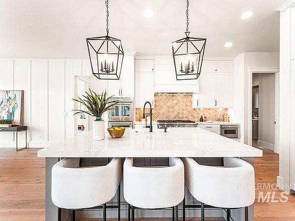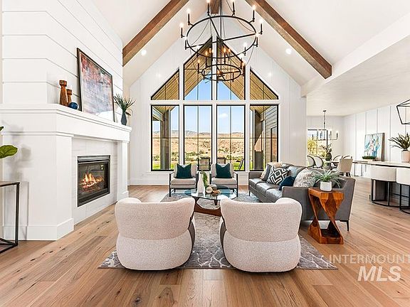Quiet luxury with extraordinary, elevated views of Boise’s rolling foothills. This stunning Highlands at Cartwright Ranch home pairs modern elegance with a serene natural backdrop, where sweeping vistas are visible from nearly every sophisticated space. Dramatic cathedral ceilings, floor-to-ceiling windows & light oak engineered hardwoods welcome you inwards towards refined living. The gourmet kitchen features custom cabinetry, crisp quartz countertops, Thermador smart appliance suite, butler’s area & walk-in pantry. The great room centers on a sleek gas fireplace, while a sunlit den is perfect for office or media room. The primary suite offers inspiring views & spa-like bath with heated floors, soaking tub & walk-in shower with dual heads. Split floor plan with secondary suites provides privacy. A covered patio with peaked roofline & built-in fire feature is perfectly positioned to overlook the unobstructed landscape. Steps from trails, community pool & clubhouse, parks, & cafés. 15 minutes to the North End.