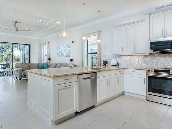 Stunning architectural details pair with the finest options and upgrades in this luxury home. This sought-after, one-story Cayman floor plan with over $60,000 in upgrades features 2,242 sq. ft. of living space, living room, formal dining room, 3 bedrooms, office, two and a half bathrooms. This lovely house boasts gorgeous upscale finishes and touches like 7 1/4" crown molding, custom walls and ceiling molding accent, and upgraded fixtures and lightings. The open kitchen features an upgraded quartz countertop, 42" wood kitchen cabinets with soft-close, and high-end appliances. The master bedroom offers a beautiful bay window overlooking the lake, two walk-in closets, and master bath with dual vanities, tub, and a large walk-in shower. Marina Bay, one of the newest and most desirable communities in Fort Myers, offers a 12,000 sq.ft. clubhouse with fully-equipped fitness center, aerobic studio, indoor basketball court, social hall, game rooms, a resort-style pool, lap pool, tennis, pickleball, and party pavilion. Close to the airport and great attractions like the Red Sox stadium, Gulf Coast Town Center, Miromar Outlets, some of the best restaurants, and the beautiful beaches.