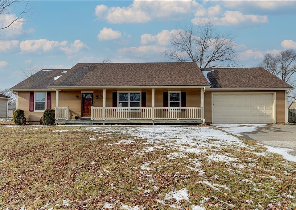 This inviting, true ranch set on 1/3 of an acre, boasts a large country kitchen with breakfast bar, pantry with pull out shelves and stainless steel appliances, refrigerator included. All kitchen appliances are less than five years old. The floor plan offers separation of primary bedroom from second and third bedrooms, new carpeting throughout and a large laundry room with washer and dryer included. The home features new exterior paint in 2022, a newer 30 year roof, gutters, garage door and opener, as well as water heater. The exterior also includes a 12' X 34' covered front porch and outbuilding for extra storage. Buyers will have choice of color on the new carpeting to installed before closing.