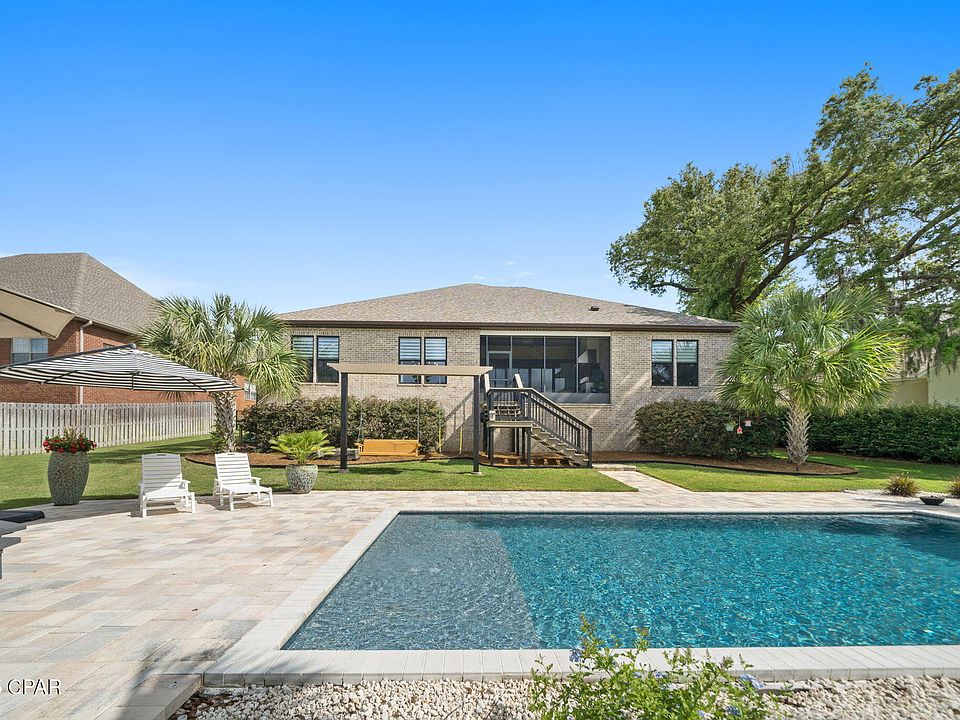 This is a remarkable find with 3 bedrooms, an oversized bonus room, 3-car garage, and pool on a single level! This home is situated in the Cove, a quaint, golf cart-friendly neighborhood, with streets lined by hundred-year-old oak trees, sidewalks and providing a serene backdrop for a comfortable life in a great community. Just a short golf cart ride away, the vibrant downtown Panama City are awaits, offering an array of restaurants, boutique shopping, breweries, and more. The streets are filled with kids riding bikes, neighbors walking and community events year-round yet still offers a cozy, quaint setting.