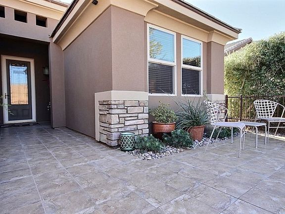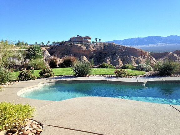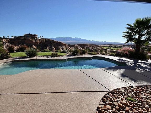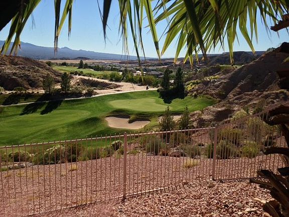 This exceptional Sun Crest home is located in a gated, active adult community. Situated on close to a quarter acre, this immaculate retreat is tucked away on a private lot high above the Falcon Ridge Golf Course with a 180 degree view of the mountains, golf course and city. The southern orientation is ideal and the surrounding scenery is stunning. You will not find a better view in Mesquite. The home has a solar heated swimming pool with gorgeous tile accents. The yard is beautifully landscaped and the spacious covered patio and extended cool decking allow plenty of room for outdoor furniture. The interior is exquisite with warm paint tones, large tile flooring, custom art niches, vaulted ceilings, granite and tile bathroom surrounds. The fireplace adds ambiance and the wall of windows across the back brings the outdoors in. The home has an oversize 3 car garage and a tiled court yard. Other features include solar tubes, den, laundry sink and cabinets and a spacious walk-in pantry.