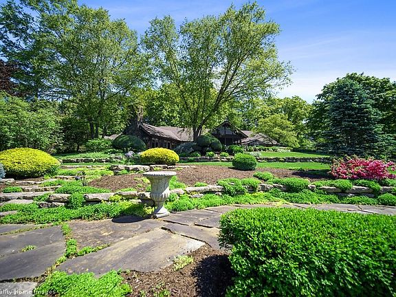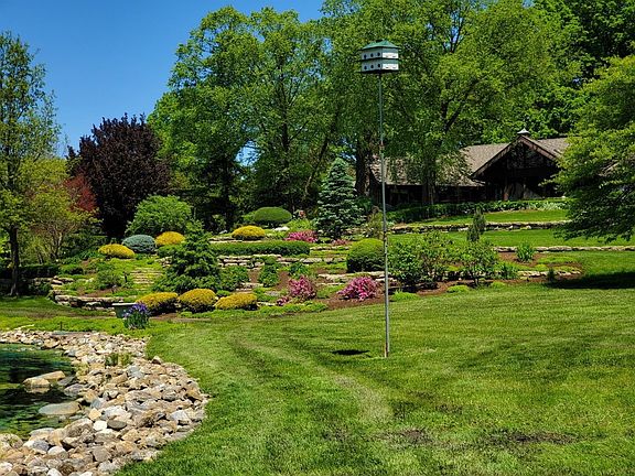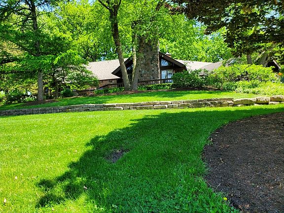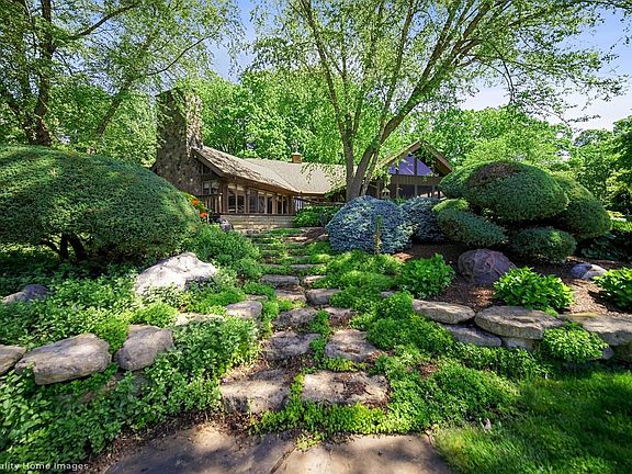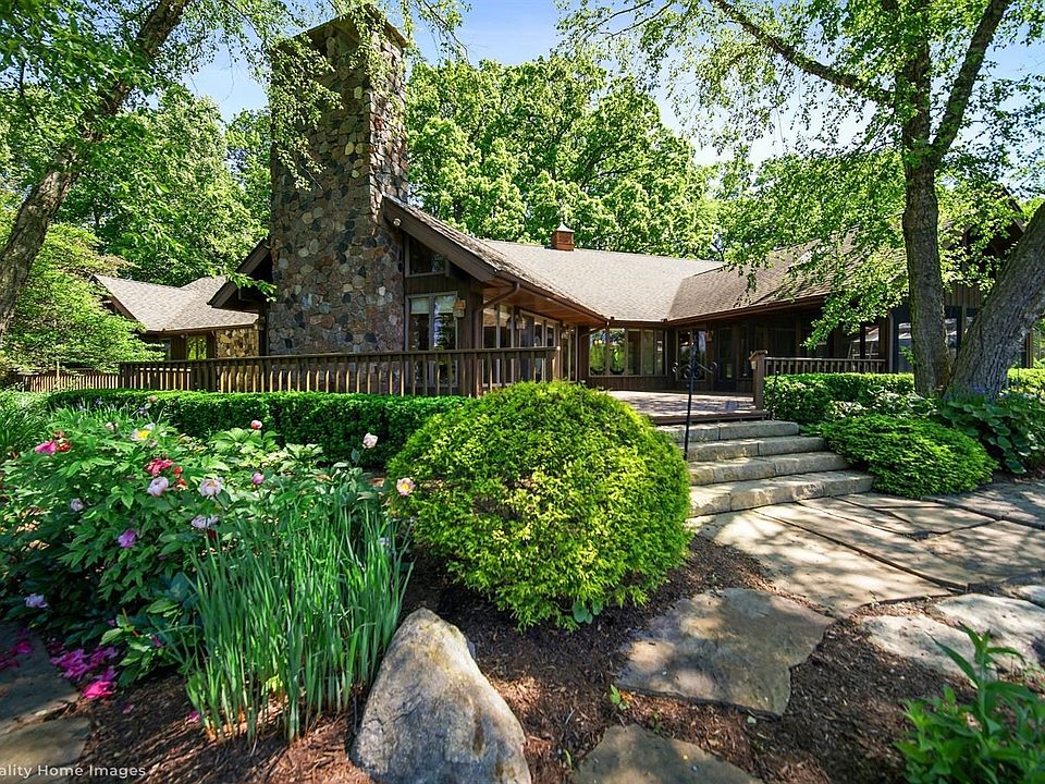 Space & tranquility found here - lodge-style home residing on 12 manicured acres is within 1 hour of Chicago & conveniently located to shops, restaurants, & major roadways. The paver drive passes the raised planters, private pond with its own island and terraced gardens. The inviting front walk meanders through a wooded, shade garden to the covered front porch. The foyer with skylight opens to the grandest of great rooms with a vaulted, paneled ceiling, natural stone fireplace, and wall of windows overlooking deck, gardens, and stocked pond. Large kitchen with SS appliances and breakfast room open to the screened porch with an exquisite view. The spacious owner's suite, guest suite, two additional spacious bedrooms, and finished laundry complete the main level. The walk-out lower level has a family room with fireplace; expansive rec room with wet bar and indoor grill; and craft room. 2 car attached garage and 4 car detached garage with pull down stairs leading to amazing man-cave.