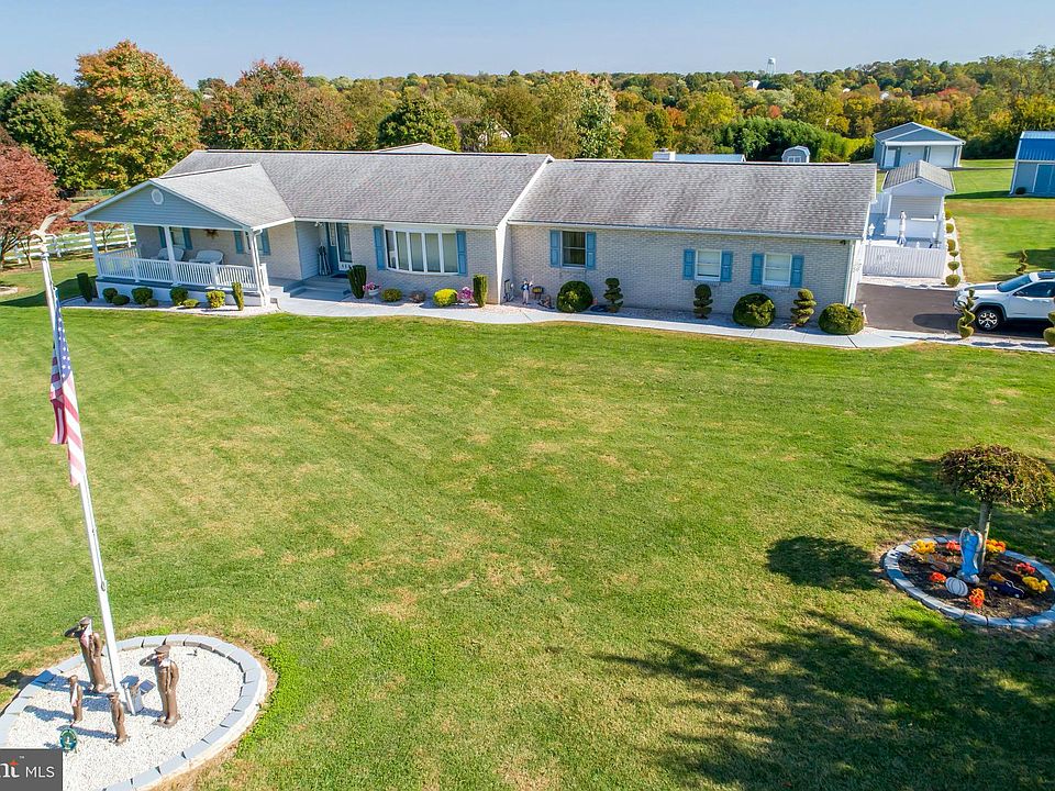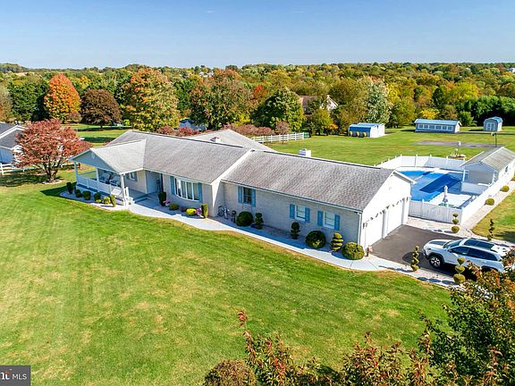 Are you a car enthusiast and need garage spaces for your cars, trucks, or other wheeled vehicles? Or maybe you have a growing business and need more storage space. This one of a kind property may be the one for you! This spacious 3 BR, 2.5 Bath Ranch home with a 2 car attached side-entry garage (24x22) and a large, partially finished basement also features numerous outbuildings. There is 5 car detached garage with it's own 200 AMP electrical service! The first Bay has a separate entrance and can accommodate a limousine (32x17), features a garage door opener, wood paneling, tile ceiling & vinyl floor. The remaining 4 Bays (72x26) are open to one another, each is individually heated and all have their own garage door opener. One of the Bays features a pit and there is also a working sink/utility tub at the back of this Bay. Further down the property is road access that leads you to another oversized 2 car detached garage (30x40) with electric, garage door openers, built-in cabinets & countertops along the rear wall. Walls are paneled and the ceiling is tiled. There is a 30x15 building that features electric and was previously a mini horse barn. Take a few steps down from the front entrance to inside and there is a back door which opens to the rear of the property (great building for goats or modify into a chicken coop; just fence in the side & rear). There are 4 additional storage buildings (32x12 with 2nd floor next to the garages; two 12x18 sheds and a 16x12 shed). All have metal roofs (March 2020) except for the 5 car detached garage and the pool shed & pool house (+ house.... roofs installed in 2015/2016). All but one of these outbuildings have a paved driveway/road for access. And there's more....there is a beautiful in-ground, vinyl pool with included diving board, a pool house with a full bathroom, a pool storage shed and all is enclosed by a maintenance free vinyl fence. This brick & vinyl Ranch home offers front & rear covered porches. Not only from the Family Room can you walk out to the covered rear porch but also from the owner's Bedroom suite. The home has a nice flowing floor plan; main floor Laundry, spacious Living & Dining Rooms as well as the Family Room which features a gas Fireplace. The Kitchen offers nice cabinet & storage space, Corian Counters, and a window above the sink overlooking the rear of the property. From the Foyer, there is a Hallway to the left that leads you to three spacious Bedrooms and a Hall Bath. From the FR, a wide & open staircase takes you to the finished lower level which features a large finished Game Room, another large, finished room (future Media Room?), plus a large storage closet and an unfinished area. An automatic Generac Generator is included. The owner has made many wonderful upgrades and updates over the years. A reverse osmosis system was installed on May 16, 2023. It is truly a beautiful & unique property, situated on 2.80 acres that has been beautifully landscaped around the house and areas of the property. The location is convenient to Route 213 & Route 273.