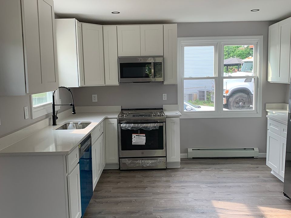 Left side of duplex (construction company has 2 room office on right side) the building was completely redone inside and out, 2 bedrooms, living room, kitchen with stainless steel appliances, full bath .. tenant pays only gas for their heat, stove and hot water, new washer and dryer in 700' unfinished basement, paverbrick patio, pets are negotiable One year lease, owner pays water and electric, tenant pays their gas for heat, hot water and stove. (No EV charging on property)