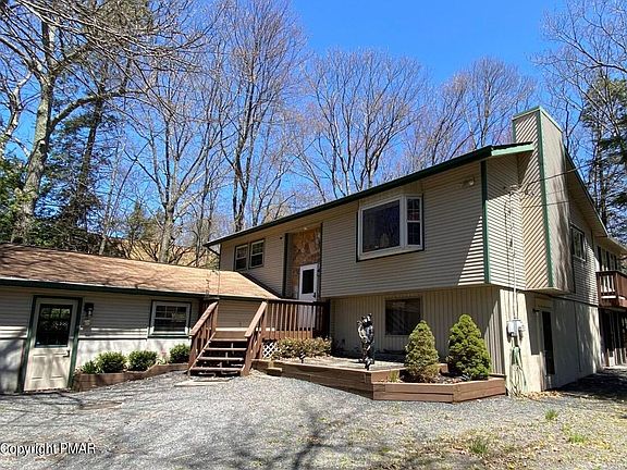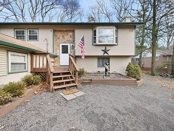 A Spectacular 3/4 bdrm 2 bath, split level home in the heart of the Poconos. This property has been a very active STR ! A home built for entertaining or for large family gatherings. Oversized eat-in kitchen spills into a bright & airy 4 season sunroom on one side & a huge open living room with fireplace and vaulted ceilings . Endless space for all your guests inside & out. A welcoming fire pit area to gather around & enjoy the Pocono evenings under the stars. Did we mention the ''Storage Galore''. A large shed/barn for all your toys and a garage! Space for your Hot Tub & outdoor sitting area under the fantastic Pergola & an outdoor bar area & 3 season room! A 1 minute walk to the newly updated community Pool. ''PUBLIC'' sewer system! *TURN KEY - furnishings included w/full price offer*