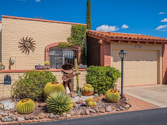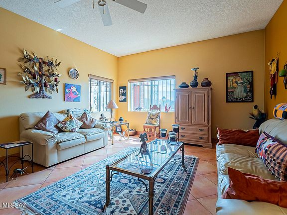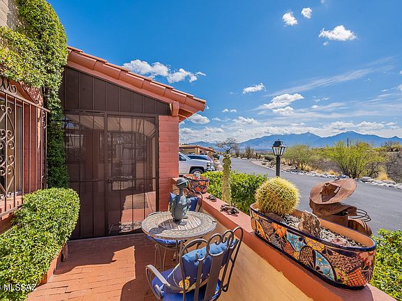 A fun and inviting townhome that celebrates the beauty and warmth of Southwestern design with warm, earthy tones as well as bold pops of color! The diagonal pattern of the terracotta tile floor sets the tone for the entire home. Enjoy the expansive views of natural desert and the Santa Rita Mountains as you relax in your living room. The kitchen features granite counters, glass top range and it is conveniently located adjacent to the dining area. The primary bedroom is spacious and the ensuite bath has an attractive custom-tiled shower. You will love spending time in the expanded space of the Arizona room - use it as an office, hobby or craft room! The outdoor patio space is terrific with a large shade tree and great views of the Santa Rita Mountains. Truly a stunning southwestern-style property that exudescharm and character at every turn and captures the essence of the Southwest!