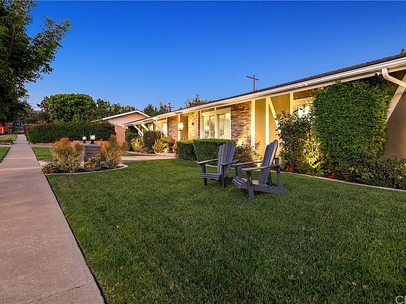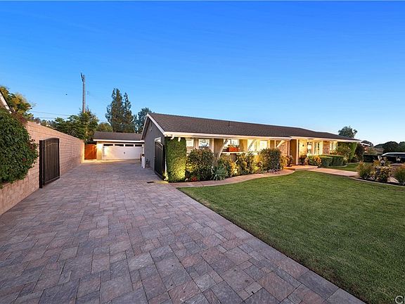 Nestled in the foothills of a highly sought out North Tustin neighborhood, this sprawling ranch style home is an entertainers delight. The floorplan is spacious and welcomes you with a dutch front door leading into the open floorplan. This home boasts a formal living room, oversized family room w/ gas-burning fireplace and dual master suites. Recessed lighting, custom baseboards, crown molding, newer roof and hardwood and terrazzo flooring throughout the home. These features coordinate with bathroom tiles and granite countertops. The added master suite includes an oversized walk-in closet, wood-beamed vaulted ceiling, additional gas-burning fireplace, large windows and double doors w/backyard access. Bedrooms have been upgraded with California Closet organizers. The newly renovated kitchen has upgraded Viking stainless steel appliances w/white custom cabinetry, a farmhouse sink and quartz countertops. An indoor laundry room doubles as a mud room w/outdoor access. 3 sets of double doors and newer double pane windows invite you to the entertainers backyard. Oversized swimming pool, 2 covered patios, and grass area encourage views of the beautiful North Tustin hills. The detached 2-car garage and long RV driveway have been newly renovated with pavers and a double gate to allow space and privacy. Finished garage has cabinetry and epoxy flooring. Off the garage sits a flex space; perfect for small office, pool room or workroom. Award-winning Tustin schools add to the homes appeal.