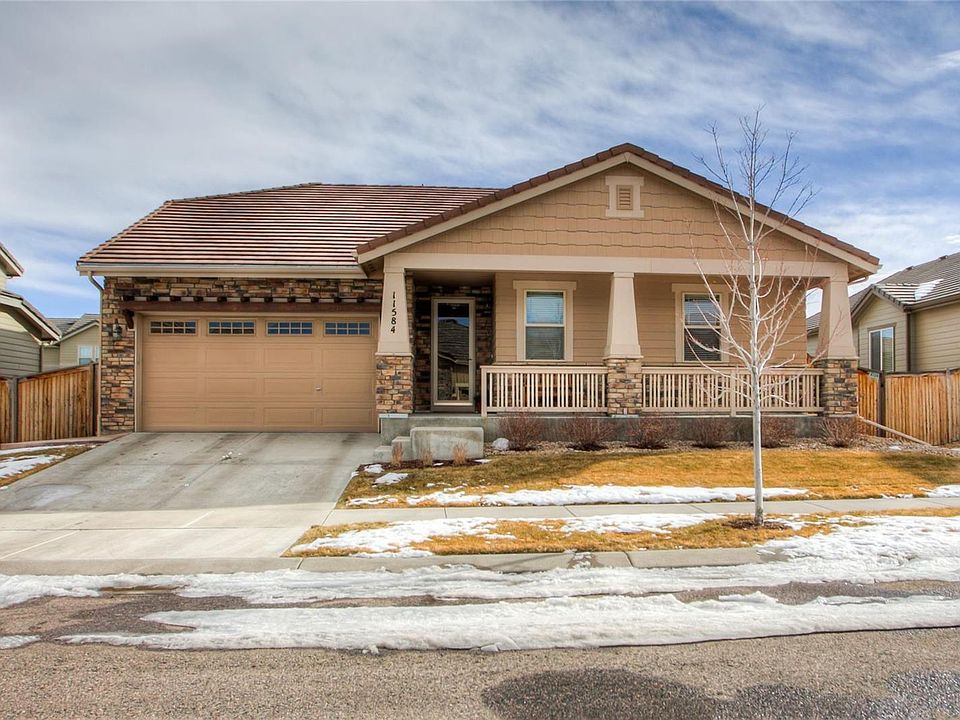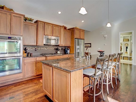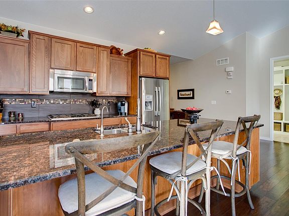 Beauty runs deep throughout this former model home located minutes from Buffalo Run Golf Course and steps from Villages East Park. Gleaming hardwood floors warmly greet you upon entry and upgrades impress throughout. There are 3 bedrooms and 2 full baths all on one floor plus an enormous open basement ready to receive your desired finishes. Fall in love with the stunning kitchen featuring granite counters, designer backsplash, five burner gas range, walk-in pantry, double ovens and 'super' island with extra seating and storage. Master suite has a five-piece bath with big garden tub and large walk-in closet. The open floor plan also boasts a stone fireplace, eating space and direct access to an inviting outdoor patio and professionally landscaped yard. Added bonuses include a large mudroom/laundry with great built-ins. BEWARE: This home may just steal your heart!