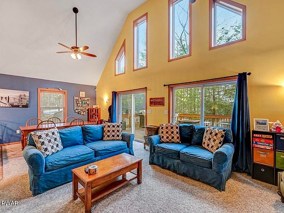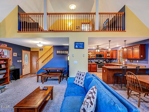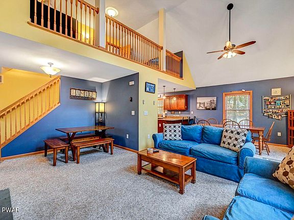 Located in Wallenpaupack Lake Estates, a four-season amenity filled community in the Northern Poconos with lake rights to Lake Wallenpaupack, a 5700 acre power boating lake, security, central sewer and water. This fully furnished, vinyl-sided chalet home is in a great location within the community. It's just a stone's throw from Deer Lake's serene picnic area and kayak launch, and a brief 1/4-mile stroll to the indoor pool and fitness center. Boasting three levels of finished living space, it features 4 bedrooms, 3 bathrooms, and modern comforts like central A/C and propane forced hot air heat. Inside, high ceilings accentuate the spaciousness, while a striking floor-to-ceiling fireplace with a propane insert adds warmth and ambiance. The fully finished lower level offers a generous recreation room with a bar and an additional bathroom, perfect for entertaining. Upstairs, the primary bedroom with its own bathroom provides a private retreat, while a large loft overlooks the inviting dining room. Convenience is key with main-level laundry and a one-car garage. Outside, a large deck, paved driveway, and hardscape with a beautiful firepit complete the picture of your ideal lakeside getaway. The community features include lakes, beaches, 2 outdoor pools, one with a water slide, an indoor pool, a fitness center, a game room, an adult lodge, tennis courts, hiking trails, gaming courts, ballfields, camping, boat ramp access to Lake Wallenpaupack and more. Central Sewer and water included in dues.
