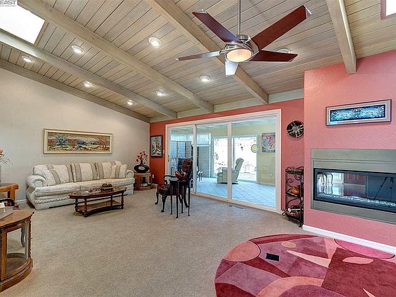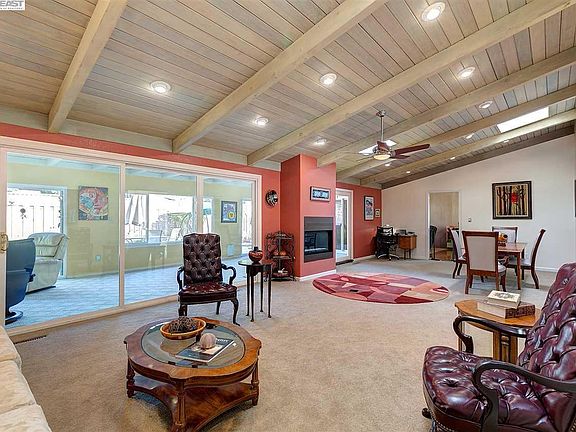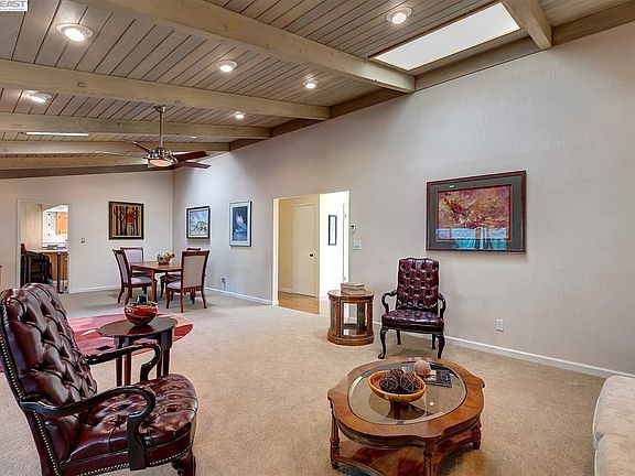 Charming Mid-Century rancher in Desirable Granada Woods. Home boasts dramatic formal living and dining rooms with vaulted, beamed white washed wood ceiling and three skylights. Large family room with vaulted Knotty Pine ceiling adjacent to very spacious kitchen with extensive cabinetry and counter space, breakfast bar and desk area. Flooring in kitchen, entry and hallways are high end laminate flooring. Fantastic sun room (not in square footage) across the back of the home with multiple uses and views to lovely back yard. Large master with original oak floors, updated master bath (handicapped assessable), wall of closet space. Yards are beautifully maintained and Sunset Magazine quality back yard. Great schools, walk to elementary and middle schools. Close to down town and easy freeway access, near ACE train and minutes to BART.