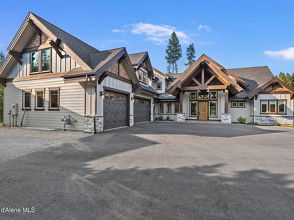 Welcome to a North Idaho estate with rustic charm. This custom built 3,409 sq. ft. residence by an award winning local builder is perfectly set on 5.08 wooded acres, offering the rare combination of seclusion, luxury, and convenience. Located just minutes from Hayden, Coeur d'Alene, and Rathdrum. From the moment you arrive, the timbered entry creates a striking first impression. Step inside to a grand entryway and living room with vaulted ceilings and exposed cedar timbers, where walls of windows frame the surrounding forest and invite abundant natural light. The heart of the home is a chef-inspired kitchen designed for entertaining. Featuring custom knotty alder cabinetry, quartz countertops, Thermador appliances, a double oven, a separate 34-inch refrigerator and a 34-inch freezer, dual dishwashers, a butler's pantry, and an oversized island, it balances functionality with elegant design. The primary suite is a true retreat, boasting a spa-like bathroom with an oversized shower featuring three shower heads, a soaking tub, and refined finishes that bring comfort and sophistication to your daily routine. Relax and unwind in the great room or on the timbered back patio, where you can watch turkey, deer, elk, and even moose roam across the property. The home offers 3 bedrooms, 3.5 bathrooms, 10-foot ceilings, and 8' solid core doors, with thoughtful touches throughout. Outdoors, the grounds are fully landscaped with an automatic sprinkler system and a paved driveway leading to a 3 car garage of over 1,000 sq. ft. For hobbies, storage, or adventure vehicles, the estate also includes a 40' x 52' insulated shop with dual 14' doors, a dream setup for RVs or boats. A seamless blend of comfort, craftsmanship, and natural beauty, this home is more than a residence, it is North Idaho living at its finest.