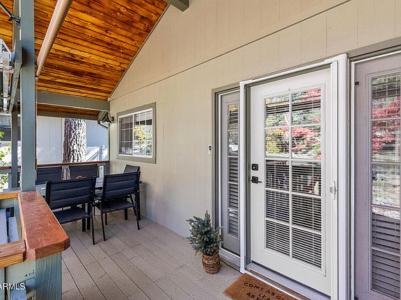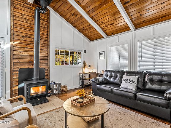 This adorable two bedroom, two bath cabin blends comfort and character. You'll be drawn in by the great curb appeal and a welcoming feel. The front porch is your first stop and features a covered deck and no-maintenance trex decking. Once inside, you'll immediately notice the vaulted T&G ceilings with exposed wood beams and skylights that fill the room with natural light. Equipped with central heat and air conditioning throughout. The wood burning stove is a focal point and additional heat source to the open great room. The kitchen is complete with lots of cabinet space and room for a full-sized dining table. The primary bedroom has a recently updated and spacious and stylish en-suite bathroom. The second bathroom has also been renovated and upgraded with a fresh, contemporary feel. For outdoor living, the backyard is fully fenced, has a fire pit, room for games and a storage shed. Whether you're looking for a summer getaway or a year-round home, this home checks all the boxes.