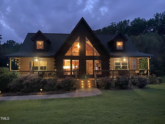 Beautiful traditional log-style home offering 2,700+ sqft on 2 unrestricted acres! ONLY 2 miles - to KERR LAKE - boat ramp at Flemingtown Rd, 4 miles to Satterwhite Point and Nutbush boating ramps! Enjoy the charm of a 28' open front porch and two 16x8 covered porches, perfect for relaxing or entertaining. Inside, you'll find Knotty Pine wood throughout giving the home a warm, rustic feel. The spacious family room features a soaring 20' ceiling, floor-to-ceiling stone gas log fireplace, and a spiral staircase leading to a loft with balcony views. The open kitchen and dining area includes a tile backsplash, center island with breakfast bar, and generous counter space for meal prep and hosting, and all appliances will stay. Main level offers 3 bedrooms, including a large primary suite with jetted tub, walk-in closet, and private bath. Upstairs features 2 additional bedrooms, a full bath, and an open loft area. Additional features include a firepit, side-entry garage with finished attic space (not in heated sqft), a detached 30x30 garage with 10x10 doors, 21x20 carport, and a 16x12 storage shed. MUST SEE!