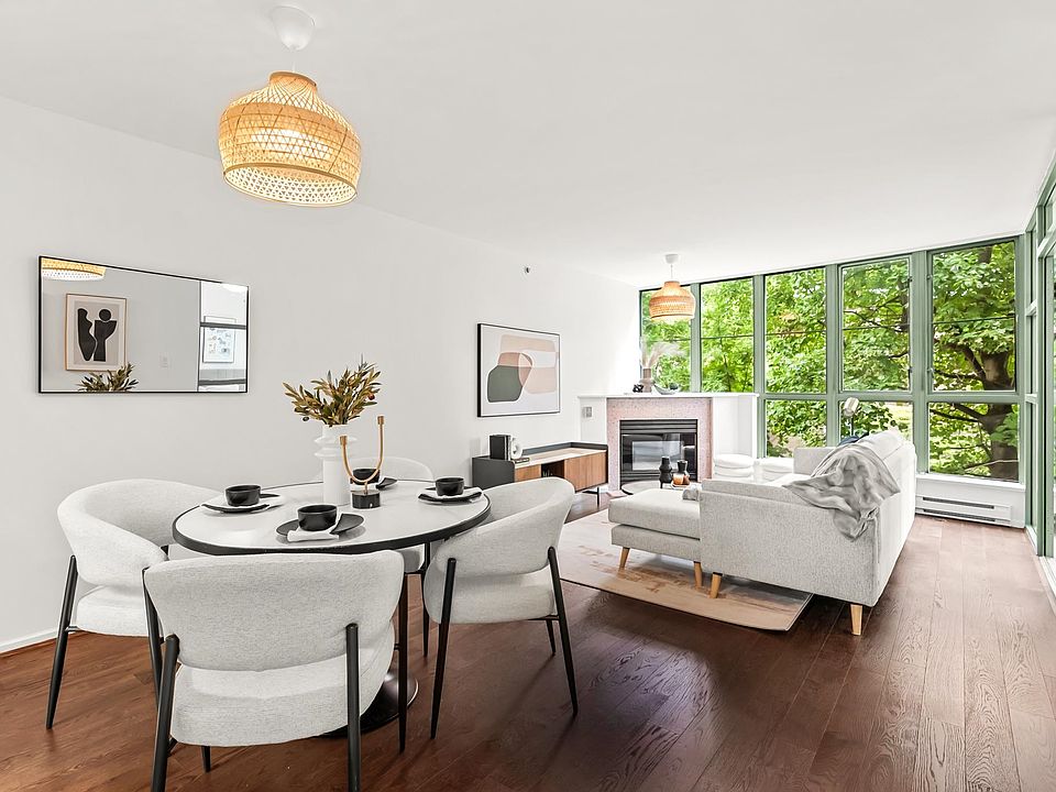 Overlooking the quiet + green courtyard, this 1 Bedroom + Oversized den large enough for a bedroom at City Gate 2 is now ready for you to call it home ! The open floorplan features a large dining room & living room area w/ cozy gas fireplace. The kitchen offers plenty of storage, an island with breakfast bar, & SS appliances. The primary bedroom is large enough for your house sized furniture, w/ plenty of closet space & a full ensuite. No need to share a bathroom as this home has a 2nd bathroom, perfect for guests. Insuite laundry, 1 parking spot & storage locker included. City Gate 2 features newly updated hallways, a gym, sauna & hot tub. Walking distance to Main Street Skytrain station, Vancouver Bus Terminal, Science World & the False Creek Seawall. Call for your private showing today!