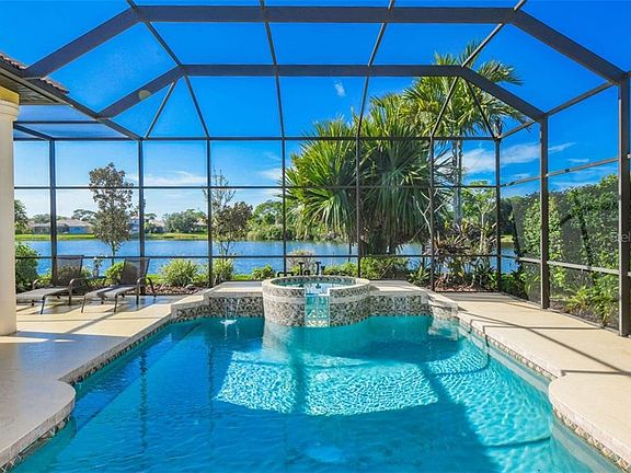 Stunning and updated Oxford model residence ideally positioned bordering long lake and preserve views and walking distance to Pine View School. Chef's kitchen in granite, trending cream wood cabinets, butler's pantry and immense breakfast bar for fantastic entertaining. Family room with built-in shelving, wine bar with wine fridge and electric fireplace for ambience. Compelling outdoor living space with a sparkling 17x24 heated pool and spa for Zen-like living, marvel at the wildlife: a menagerie of Eagles, Osprey, Otters & Turtles. Exquisite details, 12' and 14' double tray and coffered vaulted ceilings and abundant crown molding; the seller was able to achieve a truly unique home, spacious in design with unending attention to details. Master overlooks the pool, lake/preserve with the Master bath as lovely as the kitchen with corresponding cabinetry, two walk-in closets. Three additional bedrooms, three baths, one as a Jack & Jill bath, office/den with built-in cabinetry and desk. On a practical note: hurricane window protection and both ACs replaced in 2015. Three-Car garage with paver drive. Gorgeous home for the savvy buyer near Gulf Beaches, The Legacy Trail, cultural mecca of downtown Sarasota and charming Venice.