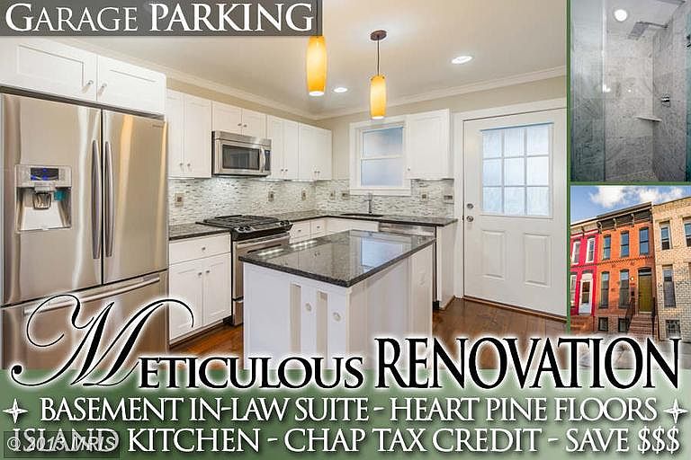METICULOUS TAX CREDIT RENOVATION WITH 3 FINISHED LEVELS & DETACHED GARAGE! Sakura hw floors & crown molding throughout, LR w/ exposed brick, Gourmet island kit w/ granite counters, ss appliances, & glass tile back splash, Master bedroom w/ tray ceilings & exposed brick, spa-like bath w/ marble tile, 2nd spacious bedroom leading to 2nd level rear deck, & detached 2 car garage! 10 Year Tax Freeze!