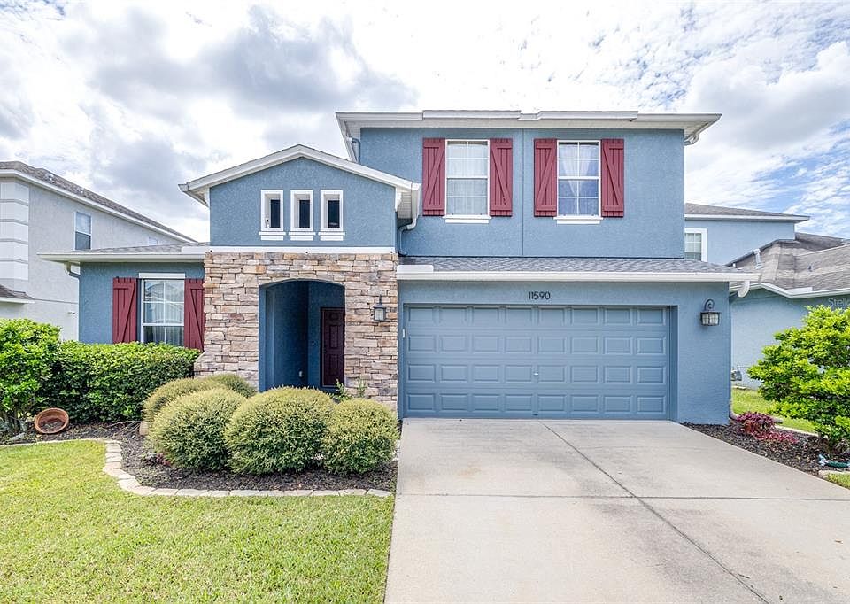 RARE 4BR/3.5BA two-story home in sought-after Panther Trace! This original-owner home features a spacious open floor plan with a large kitchen, island with bar seating, breakfast nook, and family room. Perfect for entertaining. The main-floor primary suite includes his-and-hers walk-in closets, garden tub, separate shower, private commode, and linen closet. Upstairs offers a private 4th bedroom with en-suite bath. Ideal for guests or in-laws. Formal living/dining area could be converted to a den (builder option). Enjoy peaceful pond views from the expanded screened lanai in your fenced backyard. Home includes new roof (2022), new refrigerator, natural gas, and carpet allowance offered. Full maintenance records available. Walk to Collins Elementary, parks, pool, clubhouse, tennis & soccer fields. Panther Trace offers resort-style amenities and a great community feel. Don't miss this meticulously maintained home! Use As-Is FAR/BAR contract.
