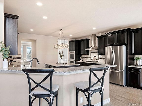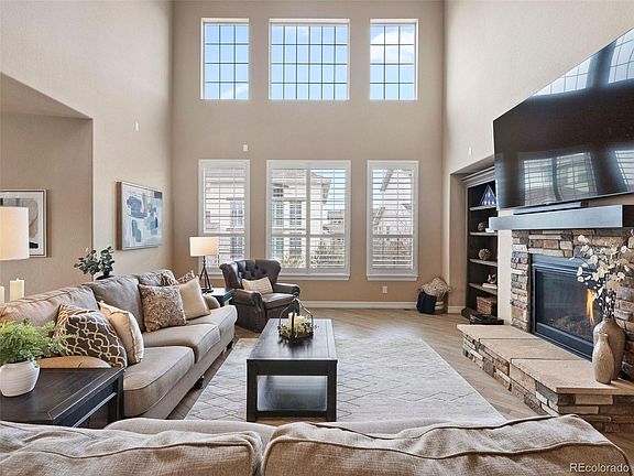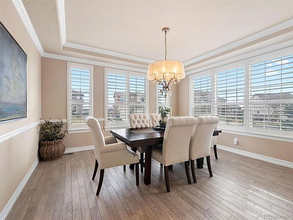 Enjoy a significant price reduction of over $200,000 - don't miss out on this special home! Unlock instant equity with this home that appraised substantially higher in March 2024! Discover impeccable custom finishes throughout this exceptional Toll Brothers home, including stunning hardwood floors, plantation shutters, crown molding, custom tile, and dazzling light fixtures. The Volare floorplan features a showcase curved stairwell, a dramatic wall of windows in the soaring two-story great room, and the rare feature of having four beautiful ensuite bedrooms, including one on the main level (3 up, 1 on the main). The expansive, highly upgraded eat-in kitchen is equipped with premium stainless Kitchen-Aid appliances, a double oven, a gas cooktop with professional-grade hood vent, a built-in microwave, and a French-door refrigerator. This incredible space is complete with a large walk-in pantry, upgraded cabinetry, slab granite countertops, stunning lighting, and a custom backsplash. The upper level hosts the primary suite with hardwood floors, three walk-in closets, and a spa-like five-piece bath. Two additional bedroom suites feature hardwood floors and upgraded ensuite bathrooms. Enjoy majestic Pikes Peak views from the private balcony of the front bedroom! The unfinished 1653 sq ft basement offers endless customization possibilities. Outside, the fenced backyard boasts a covered patio and new custom built-in fireplace, perfect for Colorado evenings. The Highlands at Parker, part of the Idyllwild community, features 300+ acres of open space, walking paths, bike trails, a community center, a fitness room, and an aquatic center with a zero-entry pool and splash park. Enjoy golfing and brunch nearby at Black Bear Golf Club or Blackstone Country Club, and explore Mainstreet Parker’s vibrant dining and shopping scene. This meticulous residence exudes sophistication at every turn, boasting over $115,000 in unparalleled post-closing upgrades!