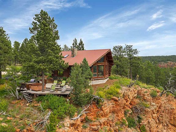 LIVING ON THE EDGE! Own most of the Canyon Rim on Red Canyon for the BEST VIEWS and MOST SECLUSION possible. First time ever offered this way. All 110 acres including the CABIN ON THE EDGE! The cabin is a one of a kind Jorgenson 3 bed/1bath log cabin that sits literally on the edge of Red Canyon with the MOST AMAZING VIEWS in all the Black Hills! Relax on the deck or soak in the hot tub and watch the birds soar! Some of the amenities inside are a two sided stacked slate fireplace, handmade furniture, and custom cupboards. The view from the dining room is beyond compare! Comfortable efficient floor plan with extra sleeping area in the loft. By having this much of the Rim there is the opportunity for complete seclusion or also developing a few more cabins (all facing south) back from the edge of Red Canyon for family, friends, or vacation rental income. A once in a life time opportunity. Come leave the world behind and soak in the peace, serenity, and amazing views!