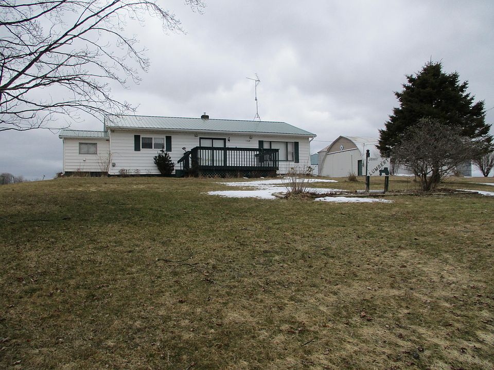 3 bedroom ranch with main floor laundry sitting on a nice 16 acre parcel on a paved road. The formal dining room offers a pellet stove and sliders to the front deck. It also has Central Air for the summer months. The full bathroom is handicap accessible. Full basement is a walk up with Belco door to the back yard. A bonus is the 2 nice spacious out buildings which offer many uses. Great place for a hobby farm or restore cars. Deer and turkeys are in the area. There are also 2 grain storage buildings and a garden shed, you could farm too. The house went thru the Eight Cap winterization program in 2019, they added insulation, new windows, new high efficient furnace, plus a new roof. The propane tank is metered and billed every month, fiber optic was run on the road recently. Call Now!
