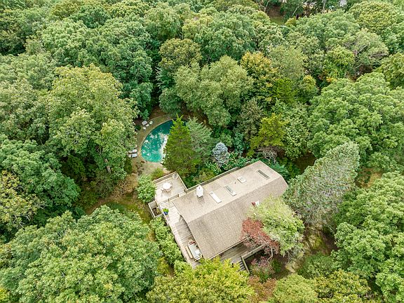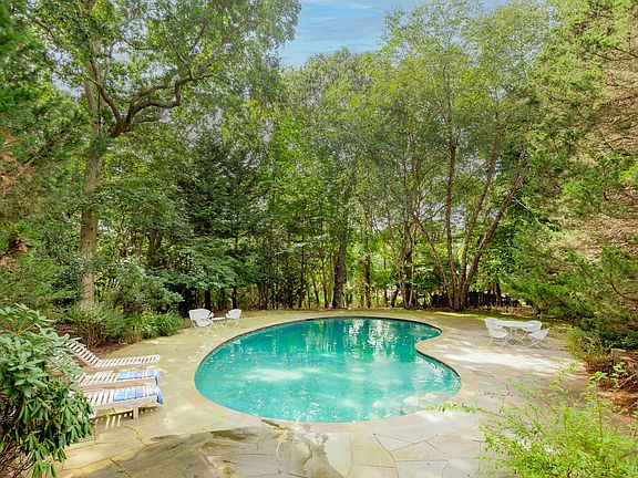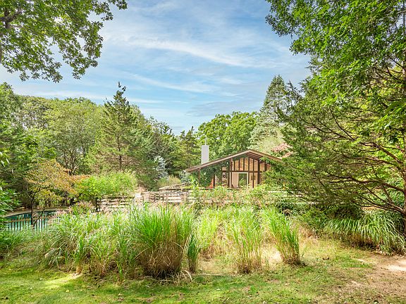 Across the street from Gardiner's Bay with a private trail to East Hampton's Barnes Landing Beach for residents, this cheery four bedroom Techbuilt style home features lovely outdoor spaces and a heated, gunite pool nestled on a beautifully landscaped acre. The airy and elevated living room, dining area, and kitchen has abundant fenestration and multiple sliding French doors to the covered dining deck and expansive wraparound decking that seem to float among the trees, perfect for al fresco entertaining. Skylights and clerestory windows that follow the pitch of the post and beam cathedral ceilings profit from beaming natural light to create a bright, open living space on the main level with practical indoor outdoor flow. The primary bedroom suite and an additional guest bedroom occupy the main level while two additional guest suites complete the lower level. Minutes from Amagansett Main Street and ocean beaches, this property presents a unique opportunity to live near the water in an architecturally intriguing Techbuilt home that has the lines for a stylish, modern renovation.