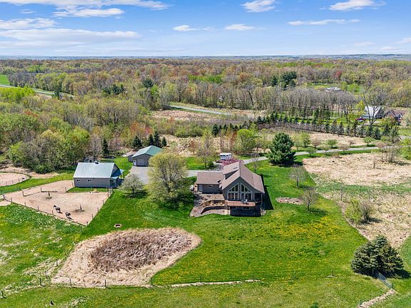 Here's a fantastic opportunity to own a 10-acre hobby farm just 45 minutes from downtown St. Paul. It features a 36 X 30 4-horse stall Wick Building with power and water, a chicken coop, pasture area with Electro Braid fencing, 1-acre of pet safe invisible fencing and a pond. The spacious 40 X 30 shed with 100-amp service offers ample storage or a great workshop for your projects. The beautiful walkout home has an abundance of windows for amazing views, new LVT flooring on the main level, a stone gas fireplace, laundry with built-in cabinets, a new composite deck, a large porch, patio and steel siding. Whether you are an avid gardener, an animal lover, or someone seeking a peaceful retreat from the hustle and bustle of city life, this hobby farm has everything you need to live your dream!