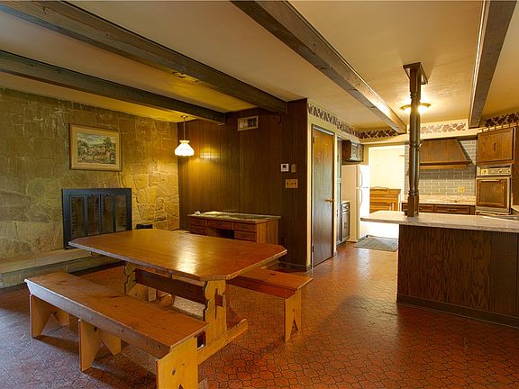 Fantastic opportunity to make this 3 Bedroom, 2 Bathroom Ranch style home yours! Massive living room with tons of natural light leads out to an approx. 300 square foot concrete patio on the side of the home. Kitchen is open to the dining room which features a wood burning fireplace and access to the approx. 200 square foot rear patio and backyard. Three spacious bedrooms with ample closet space, including one room with an en-suite full bathroom. Enormous unfinished basement has high ceilings and could easily be made into a game room. Two car attached garage with additional parking space in the driveway. All situated on a serene 1.19 acre lot just minutes to Rt40 and the Mon Fayette Expressway. House in need of some TLC but has solid bones!