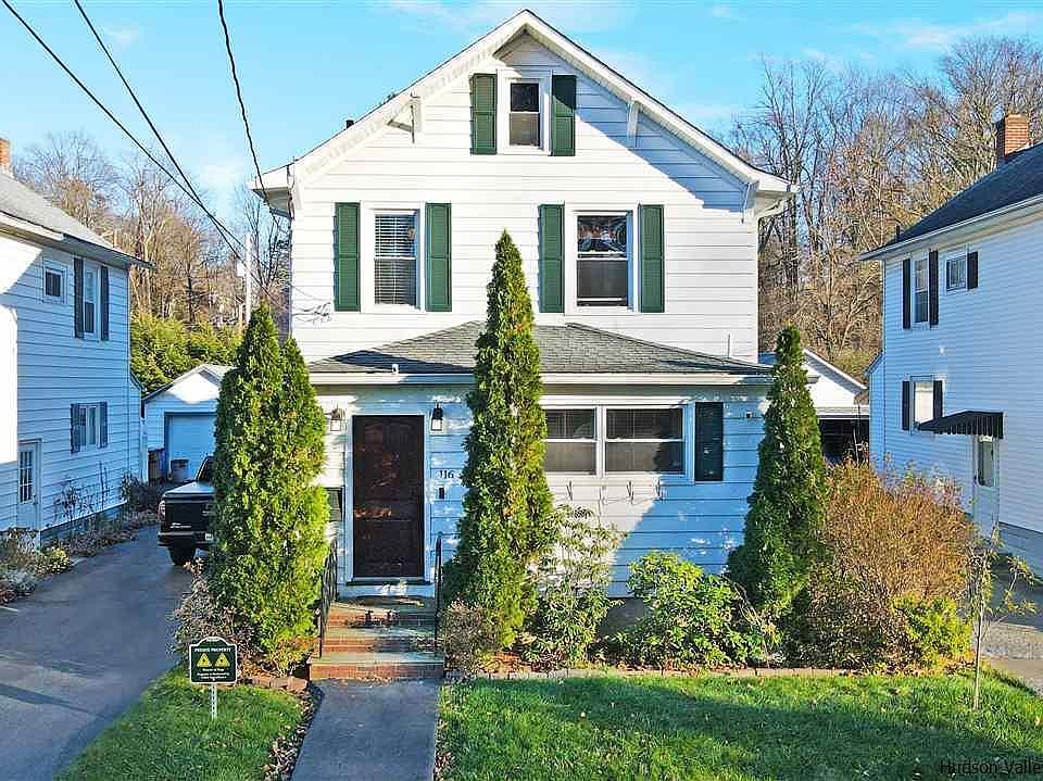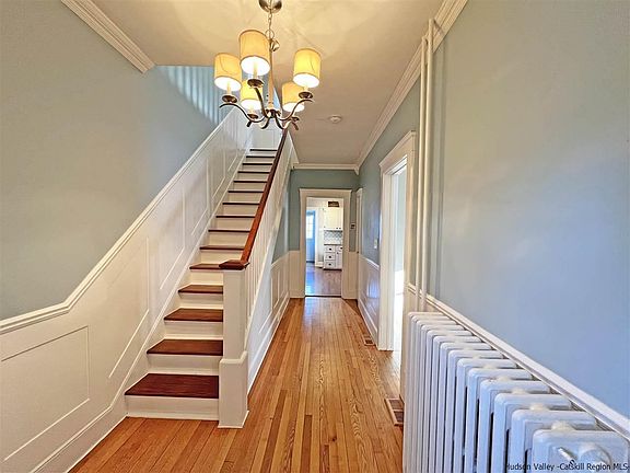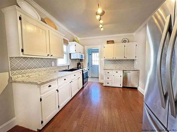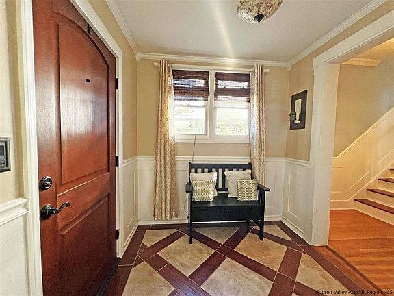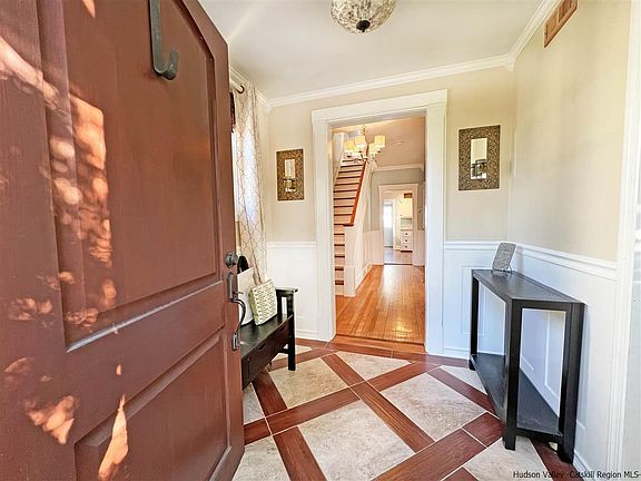 Pride of ownership is evident in this exceptionally maintained and delightfully updated Kingston home. Notable improvements within the past few years include central air installation, heat pump, updated bathrooms, renovated kitchen with stainless steel appliances, whole house water filtration system and electric panel. This home has a classic layout and gets fantastic light throughout the day. There is no shortage of character with beautiful hardwoods, crown moulding, wainscoting, and high ceilings throughout. Walk up attic offers convenient space for storage. The basement is very dry and was partially finished at one time, with a mini split in place for heating and cooling. This level would easily make a great playroom or workout area. Outside, there is a one car detached garage with electric. The modest backyard is fully enclosed and has a concrete patio. Architectural roof is less than 10 years young and is outfitted with Tesla solar panels to offset electrical costs. Convenient location to schools, hospitals and great restaurants- just one mile from the historic Rondout waterfront.