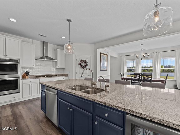 The heart of the home features a huge island with wine fridge, Double Oven, Gas cooktop, large pantry, Office just around the corner of the dinning room. The LVP flooring downstairs helps the open concept shine. One bedroom with a full bath is located downstairs. Home Features Fiber with Cat 6 running through the home, Security system with Cameras, Water osmosis system, fence backyard, Tankless gas water heater.
