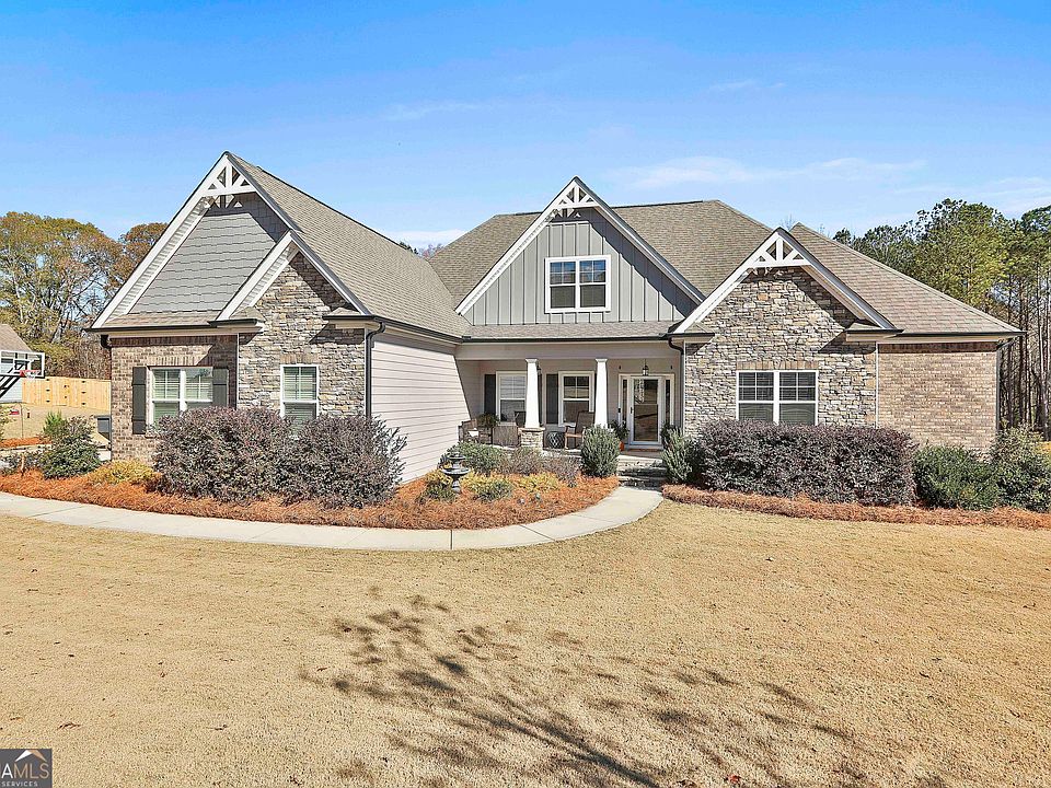 Situated on a one acre lot, this like-new, craftsman beauty is just waiting for you to call it home! This Greywell floor plan features 5 generously sized bedrooms and 4.5 bathrooms, a basement, 3-car garage and an additional detached 2 car garage! The main level is open and airy with hardwood floors throughout. The dining room seats 12+ and has a coffered ceiling. The living room has a stone fireplace and big picture windows that let in all of the beautiful, natural light. The eat-in kitchen is an entertainers paradise - with an open view to the living room, two islands, marble countertops, white cabinets, stainless steel appliances, and a spacious walk-in pantry. Off the kitchen is a half bath, the laundry room, and a separate sitting area that leads to the screened in game day porch with a cozy fireplace! The primary suite features hardwood floors, a tray ceiling, double vanity, soaking tub, separate shower and a California closet system. The guest suite features hardwood floors, a cathedral ceiling and a tile shower. Head upstairs to find 3 additional bedrooms, 2 of which share a jack and jill bathroom. The unfinished basement with interior/exterior entry has been stubbed for a bathroom and the owners have recently added an hvac. The large patio will be great for entertaining in the warmer months! The backyard has a privacy fence, koi pond, pool with spill-over spa, plus a firepit area! The detached 2-car garage also has an unfinished room above. Minutes to shopping, restaurants, and easy access to I-85, make this a must see today!