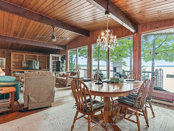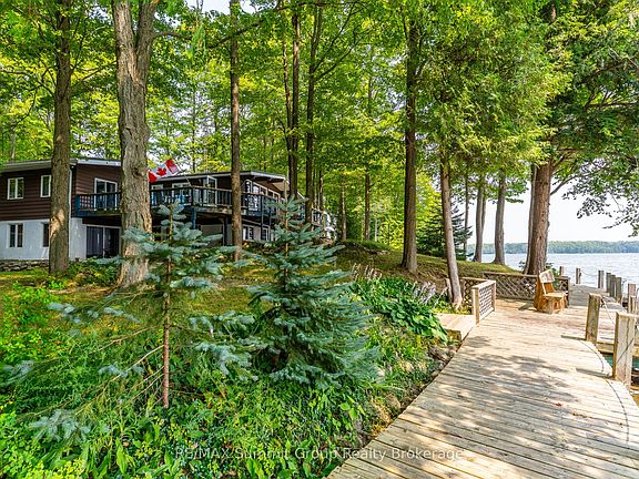 Where the shoreline stretches wide and the seasons play out at your front door, this Lake Eugenia property delivers space, privacy, and four-season fun. At least 180 feet of south-facing shoreline sets the stage for year-round living or your future build. Once an original double lot, this 0.639-acre property is mostly treed and natural, with a forest floor that blends seamlessly into the shoreline. A full-length walkway stretches across the water's edge, set over a stone wall, leading to a dock for deeper-water access. At the west end, a sandy beach with a gentle, shallow entry is perfect for children or relaxed wading. The Viceroy-style bungalow, built in 1968 with a later-added basement, offers a total of five bedrooms and two bathrooms. The main floor features three bedrooms and a five-piece bath, along with a galley kitchen that opens to the dining and living rooms. Expansive windows frame the lake views, and multiple walkouts lead to a wraparound deck, perfect for morning coffee, summer meals, or simply soaking in the scenery. The walkout lower level includes two additional bedrooms, a three-piece bath, and a laundry area, plus a spacious rec room warmed by a propane fireplace with direct access to the outdoors. The main heat source is electric baseboard throughout, and the septic system was replaced in 2021 and a Hy-Grade metal roof in 2006. A detached, uninsulated, oversized double-car garage provides space for vehicles and gear. This property is ideal for those seeking a premium lot with an affordable cottage to enjoy as-is, or for anyone planning to build a custom waterfront retreat now or in the future. Whether your days are spent swimming, paddling, or fishing from your dock, skiing at nearby Beaver Valley Ski Club, or hiking the Bruce Trail, this location offers four seasons of recreation and the rare privacy that comes with such generous frontage on Lake Eugenia.