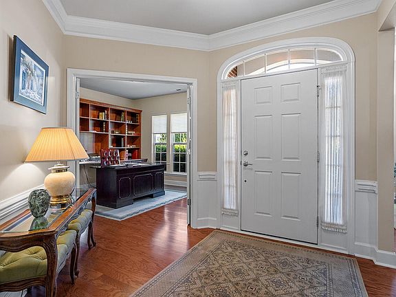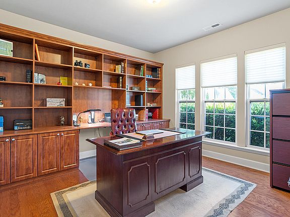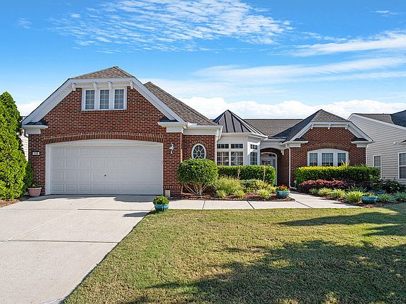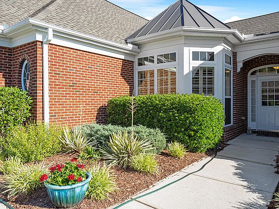 Welcome to the elegant yet comfortable Cumberland Hall! The full brick front and exquisite landscaping set the stage for the gorgeous interior: a dedicated office with a complete wall of custom built-ins; NEWER hardwood floors in all of the common areas, light-filled sunroom, primary bedroom with custom closet design. NEWER A.C., gas water heater, ROOF, dishwasher, garbage disposal. Garage with epoxied floor. Seller added not one but two retractable awnings providing shade over the extended patio with brick pavers. Enjoy the grill connected to a natural gas line. Tons of space with 3 bedrooms, 2.5 baths, office, living room, dining room , sunroom, kitchen & large breakfast nook. But best of all - the house is WALKING distance to the clubhouse. This 55+ active adult community has something for everyone!